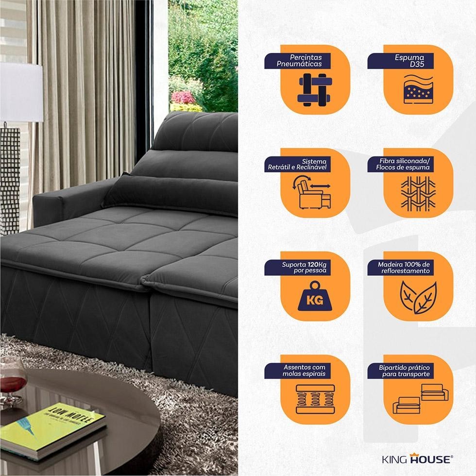 Sofá Retrátil Reclinável Amsterdam 3,00m Suede Velut Cinza Molas no Assento - King House