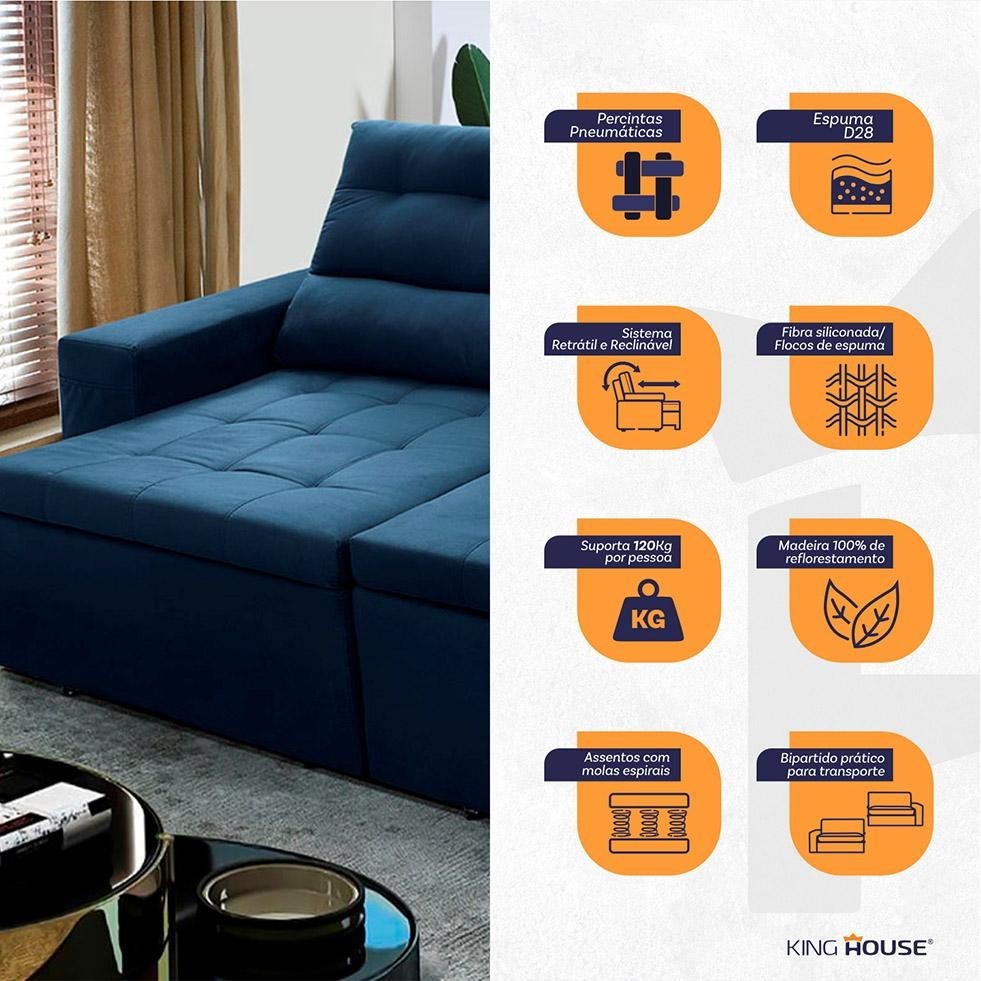 Sofá Retrátil/Reclinável Arizona 2,30m Suede Velut Azul Marinho - King House