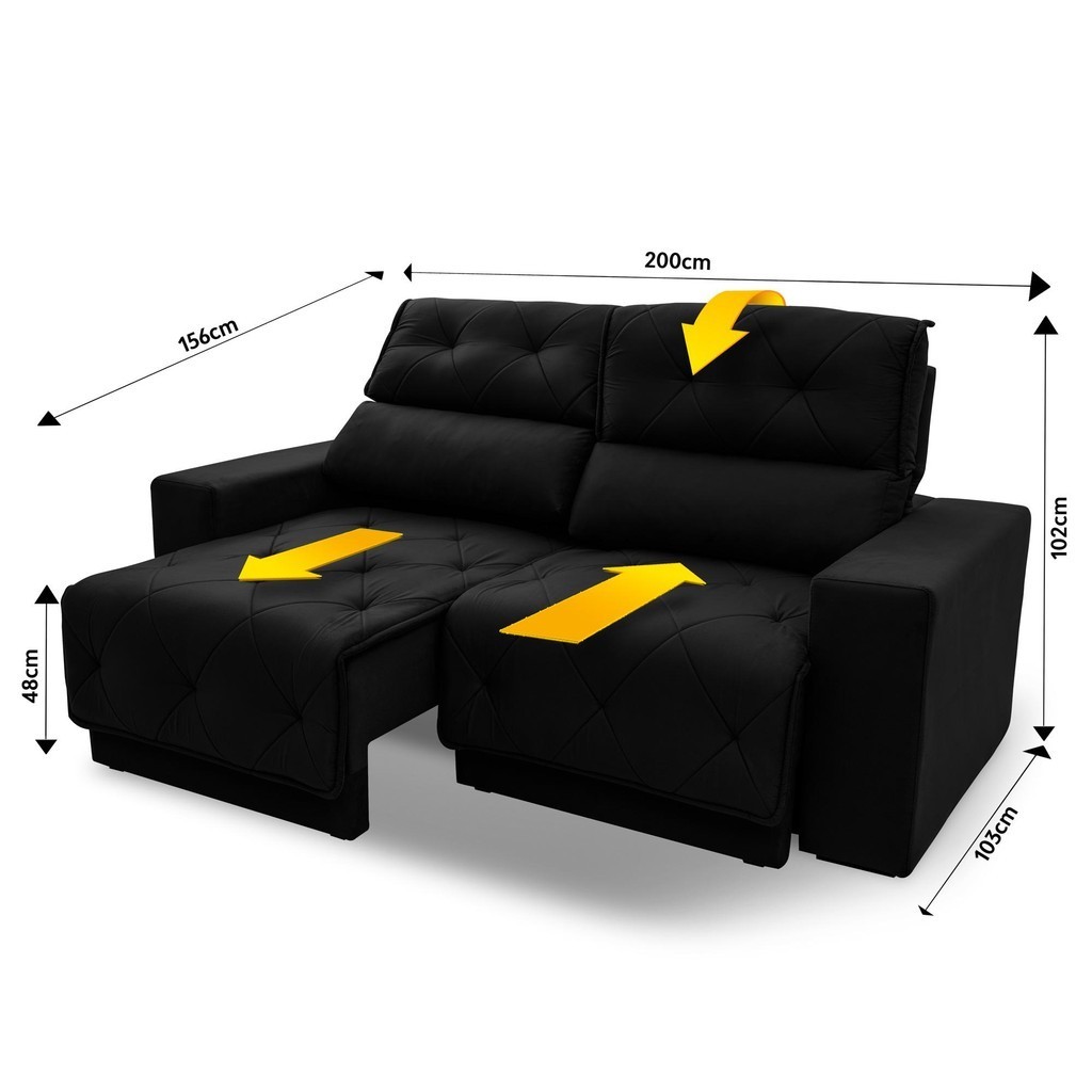 Sofá Retrátil Reclinável Belga 2,00m Suede Velut Preto Molas no Assento