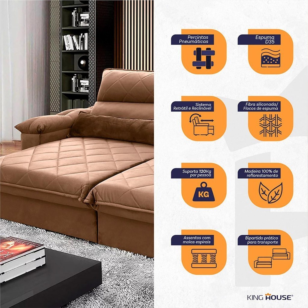 Sofá Retrátil Reclinável Grécia 3,00m Suede Velut Bege Molas no Assento - King House