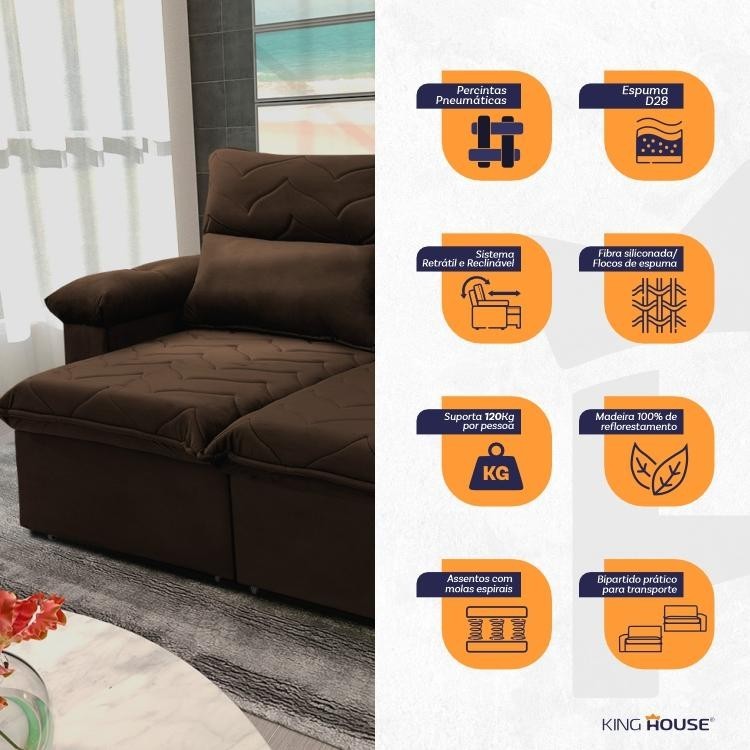 Sofá Retrátil Reclinável Paris 2,00m Suede Velut Marrom Molas no Assento - King House