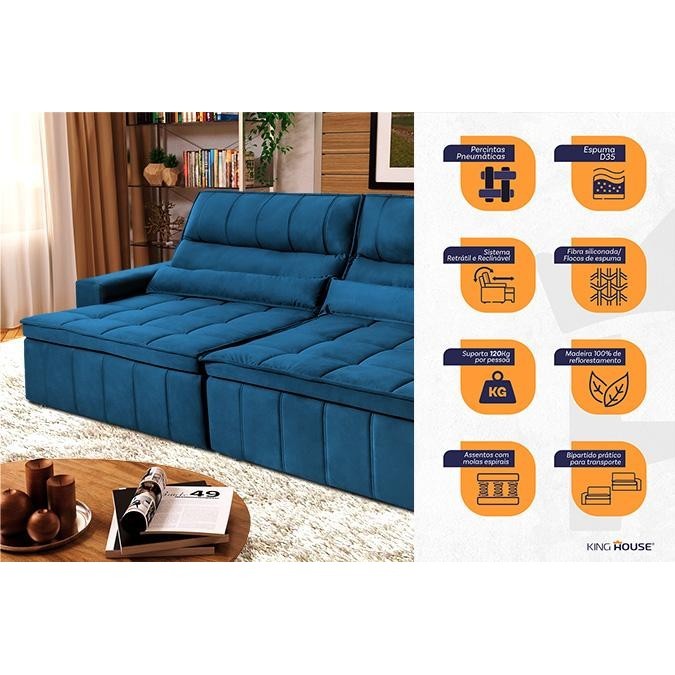 Sofá Retrátil Reclinável Supremo 2,30m Suede Velut Azul Marinho Molas no Assento - King House