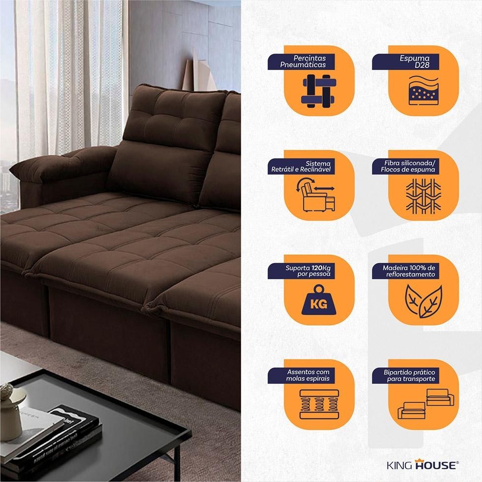 Sofá Retrátil Reclinável Verona 2,30m Suede Velut Marrom Molas no Assento - King House