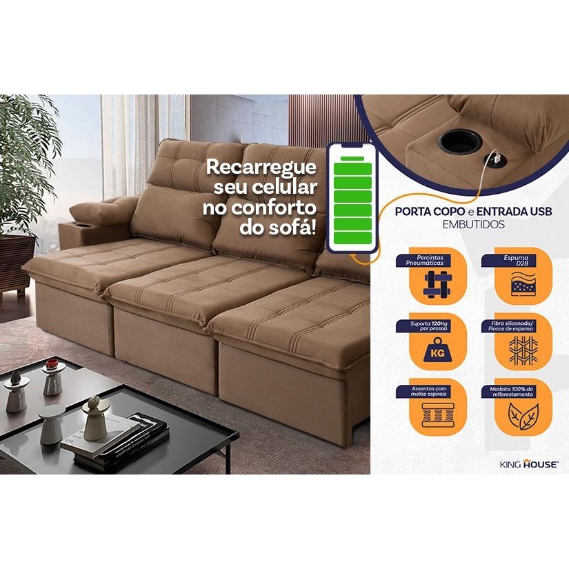 Sofá Retrátil Reclinável Verona USB + Porta Copo 2,30m Suede Velut Bege c/ Molas no Assento