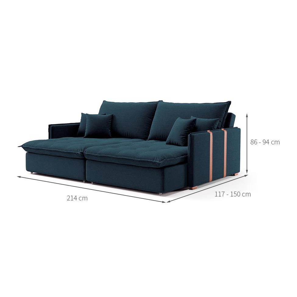 Que tal o Sofá Retrátil sem Caixa Solomons? Aconchegante e receptivo, o Sofá Retrátil sem Caixa Solomons tem tudo para deixar sua casa mais confortável. Estruturado em materiais resistentes, ele tem assento e encosto com enchimento em espuma e almofadas soltas em plumante de silicone, conferindo muito bem-estar e aconchego a quem está usando. Além de ser acolhedor e se transformar também em sofá-cama, o móvel é ideal para ambientes menores, pois é do tipo sem caixa, que otimiza o espaço disponível no cômodo e libera mais área de circulação. Tudo isso é arrematado com um design clean e elegante que destaca a cor atemporal e com certeza vai deixar seu cantinho impecável, digno de muitos elogios. Garantia em Meses: 3 Cores do Produto: Azul Instruções/Cuidados: Limpar com pano seco Conteúdo da Embalagem: 1 Sofá - Entregue em: 2 Volumes Modelo: Sofá-Cama Número de Volumes: 1 Material: O Sofá Sem Caixa Solomons possui estrutura em madeira de eucalipto 25mm, almofadas soltas com plumante 100% siliconado, revestimento em Linho, detalhe lateral em tecido sintético e acabamento com puxões nos assentos e encostos. (Sofá Bipartido) Material para Filtro: Eucalipto Descrição do Tamanho: Aberto: Altura: 86 cm | Largura: 214 cm | Profundidade: 150 cm / Fechado: Altura: 94 cm | Largura: 214 cm | Profundidade: 117 cm Altura do Produto (cm): 94 Largura do Produto (cm): 214 Comprimento do Produto (cm): 117 Peso do Produto (Kg): 67.5 Produto precisa de Montagem?: Sim, sugerimos a contratação do nosso serviço de montagem (para os CEPs em que o serviço está disponível) ou de algum profissional experiente de sua preferência Tipo de pé: Fixo Altura do assento até o chão (cm): 48 Material da estrutura: Eucalipto Material do enchimento do assento: Espuma D23 Material do enchimento do encosto: Plumante de Silicone Material do Revestimento: Linho Possui Baú?: Não Tipo de assento: Retrátil Material dos pés: Polipropileno PROFUNDIDADE x LARGURA x ALTURA: 117 x 214 x 94 Fornecedor: Lidiane M. T. A. Batista - ME É com chaise: Não Tipo de produto: Sofá É sofá-cama: Não É de canto: Não Baterias são necessárias?: Não Certificação de teste externa: Não Componentes incluídos: Não Is Fragile: Não Número da peça: Não Produto: Sofá Quantidade de lugares: 3 É reclinável: Sim Tipo do Sofá: Inclui manual de montagem: Não