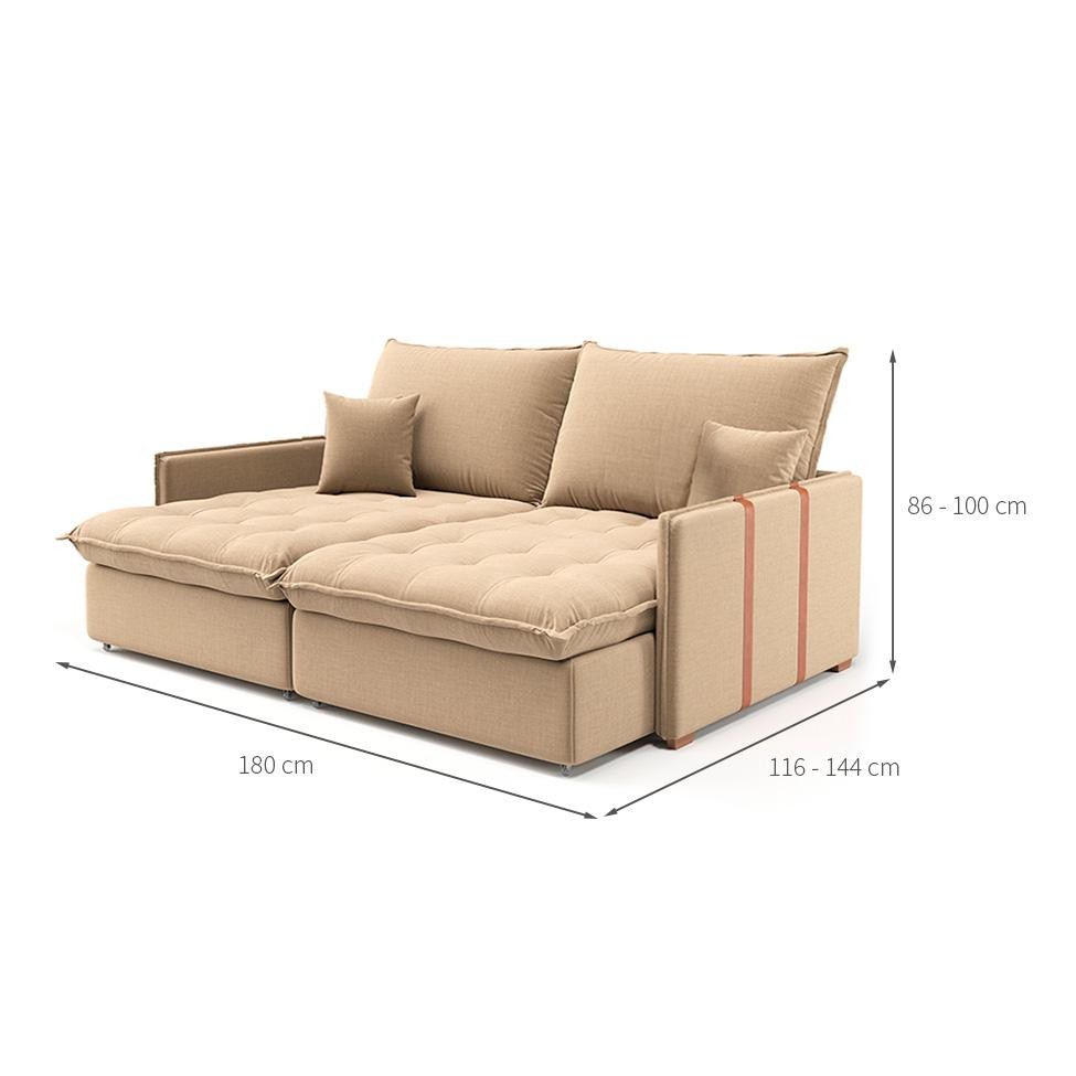 Que tal o Sofá Solomons?Um sofá retrátil é aquele tipo de móvel que transforma a sala de estar em um cantinho repleto de conforto e praticidade, já que durante o dia acomoda a família e os convidados, enquanto nos momentos de descanso basta deslizar o assento retrátil para garantir uma experiência ainda mais aconchegante e relaxar depois de um dia agitado. Cheio de estilo, ele não tem caixa, o que deixa a estrutura mais slim e agrega charme à decoração, enquanto a cor de bom gosto do linho e o detalhe de faixa lateral oferece elegância - com ele, a rotina da casa ganha o equilíbrio perfeito entre usabilidade e bom beleza! Cor: Bege Garantia em Meses: 3 Cores do Produto: Bege Instruções/Cuidados: Limpar com pano seco Conteúdo da Embalagem: 1 Sofá - Entregue em: 1 Volume Modelo: Retrátil e Reclinável Número de Volumes: 1 Material: O Sofá sem Caixa Solomons possui estrutura em Eucalipto reflorestado 25mm, assento com enchimento em espuma D23 e molas ensacadas, encosto com enchimento em espuma D23 e plumante siliconado, revestimento em Linho e acabamento em puxão. Acompanha almofadas Material para Filtro: Eucalipto Descrição do Tamanho: Aberto: Altura: 86 cm | Largura: 180 cm | Profundidade: 144 cm / Fechado: Altura: 100 cm | Largura: 180 cm | Profundidade: 116 cm Altura do Produto (cm): 100 Largura do Produto (cm): 180 Comprimento do Produto (cm): 116 Peso do Produto (Kg): 62 Produto precisa de Montagem?: Sim, sugerimos a contratação do nosso serviço de montagem (para os CEPs em que o serviço está disponível) ou de algum profissional experiente de sua preferência Tipo de Encosto: Reclinável Tipo de pé: Fixo Altura do assento até o chão (cm): 47 Material da estrutura: Eucalipto Material do enchimento do assento: Espuma D23 Material do enchimento do encosto: Espuma D23 Material do Revestimento: Linho Possui Baú?: Não Tipo de assento: Retrátil Material dos pés: Madeira PROFUNDIDADE x LARGURA x ALTURA: 116 x 180 x 100 Fornecedor: Lidiane M. T. A. Batista - ME Tipo do Sofá: null Quantidade de lugares: 3 Inclui manual de montagem: Não