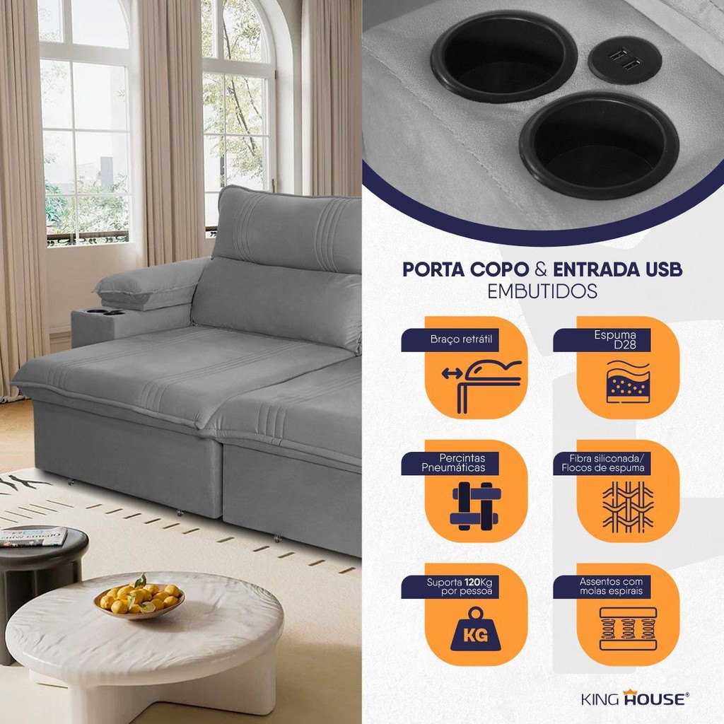 Sofá Retrátil Tesla 2,40m USB e Porta Copo Suede Cinza