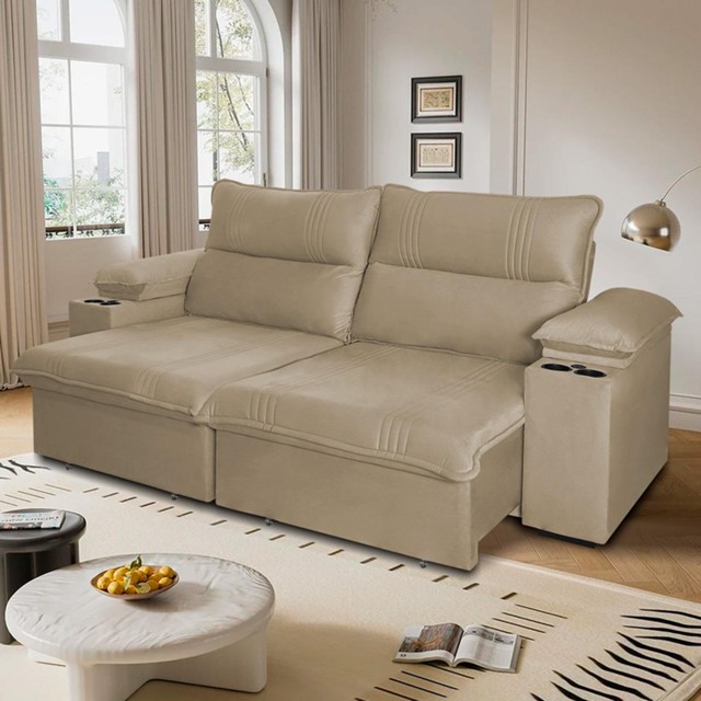 Sofá Retrátil Tesla 2,80m USB e Porta Copo Suede Bege