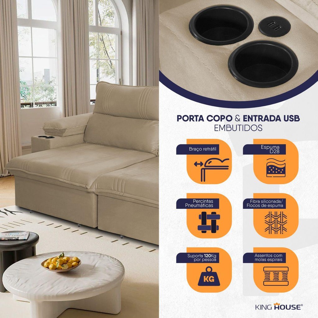 Sofá Retrátil Tesla 3,10m USB e Porta Copo Suede Bege