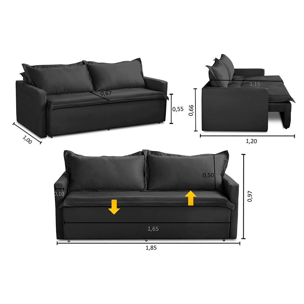 Sofá Sem Caixa Retrátil e Reclinável Kiara possui uma funcionalidade inteligente, um design elegante, além de proporcionar o equilíbrio perfeito entre estilo e comodidade. Medidas do Produto Montado: - Largura: 1,85m - Altura: 0,97m - Profundidade total fechado: 1,00m - Profundidade total aberto: 1,20m - Largura de assento: 1,65m - Profundidade do assento fechado: 0,67m - Profundidade do assento como cama: 1,15m - Altura do assento ao final do encosto: 0,50m - Braço: 0,10m - Chão ao assento: 0,55m - Chão ao final do braço: 0,66m Especificações Técnicas: Encosto:Composto por 2 almofadas soltas com enchimento de 80% fibra e 20% flocos que proporcionam maciez e conforto. Assento:Composto pelo conjunto de Molas Bonnel, Espuma D-33 e percintas elásticas de 5mm que são esticadas por uma percintadeira, que garante a melhor qualidade para o conforto e durabilidade do assento. Estrutura:Sua estrutura é toda composta por madeira de eucalipto 100% reflorestada, fixada por grampos galvanizados que vão fazer todo o trabalho de manter uma estrutura firme, com alta qualidade e durabilidade. Informações relevantes: - Esse produto suporta de 130 a 150kg por assento. *Este produto vai embalado em 1 Volume. Garantia 90 dias após o recebimento do produto. Instruções de limpeza:Utilizar um pano limpo e seco.Não limpe com escovas ou produtos abrasivos. Observações importantes: - As imagens são meramente ilustrativas, não acompanham objetos de decoração e eletros; - As cores dos produtos podem sofrer alterações dependendo do seu monitor, tela de celular ou lote do tecido. - Todos os produtos vão embalados com total segurança; - Confira a embalagem e o produto no ato da entrega, caso o produto esteja em desacordo recuse imediatamente. - Não nos responsabilizamos no ato de entrega por montagens, desmontagens, instalações de produtos, nem uso de guinchos ou equipamentos para acesso a pisos superiores em apartamentos. - Confira as dimensões do produto no momento da compra e certifique-se de que passará por escadas, elevadores, portas e corredores. Observando as orientações acima, evita-se futuros desagrados ou imprevistos com a entrega do produto. CASO TENHA, A MONTAGEM DO PRODUTO É DE RESPONSABILIDADE DO COMPRADOR, NÃO EFETUAMOS A MONTAGEM DO PRODUTO. *As transportadorasNÃO SOBEMescadas, elevadores e não adentram residências* - A entrega será feita até a porta ou portaria do endereço no qual o pedido foi feito, qualquer necessidade de movimentação do produto até o local onde ele será utilizado é de inteira responsabilidade do CLIENTE, caso haja algum dano ou qualquer coisa do tipo no produto durante a movimentação NÃO NOS RESPONSABILIZAMOS.