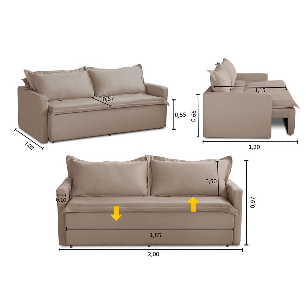 Sofá Sem Caixa Retrátil e Reclinável Kiara possui uma funcionalidade inteligente, um design elegante, além de proporcionar o equilíbrio perfeito entre estilo e comodidade. Medidas do Produto Montado: - Largura: 2,00m - Altura: 0,97m - Profundidade total fechado: 1,00m - Profundidade total aberto: 1,20m - Largura de assento: 1,80m - Profundidade do assento fechado: 0,67m - Profundidade do assento como cama: 1,15m - Altura do assento ao final do encosto: 0,50m - Braço: 0,10m - Chão ao assento: 0,55m - Chão ao final do braço: 0,66m Especificações Técnicas: Encosto:Composto por 2 almofadas soltas com enchimento de 80% fibra e 20% flocos que proporcionam maciez e conforto. Assento:Composto pelo conjunto deMolas Bonnel, Espuma D-33 e percintas elásticas de 5mm que são esticadas por uma percintadeira, que garante a melhor qualidade para o conforto e durabilidade do assento. Estrutura:Sua estrutura é toda composta por madeira de eucalipto 100% reflorestada, fixada por grampos galvanizados que vão fazer todo o trabalho de manter uma estrutura firme, com alta qualidade e durabilidade. Informações relevantes: - Esse produto suporta de 130 a 150kg por assento. *Este produto vai embalado em 1 Volume. Garantia 90 dias após o recebimento do produto. Instruções de limpeza:Utilizar um pano limpo e seco.Não limpe com escovas ou produtos abrasivos. Observações importantes: - As imagens são meramente ilustrativas, não acompanham objetos de decoração e eletros; - As cores dos produtos podem sofrer alterações dependendo do seu monitor, tela de celular ou lote do tecido. - Todos os produtos vão embalados com total segurança; - Confira a embalagem e o produto no ato da entrega, caso o produto esteja em desacordo recuse imediatamente. - Não nos responsabilizamos no ato de entrega por montagens, desmontagens, instalações de produtos, nem uso de guinchos ou equipamentos para acesso a pisos superiores em apartamentos. - Confira as dimensões do produto no momento da compra e certifique-se de que passará por escadas, elevadores, portas e corredores. Observando as orientações acima, evita-se futuros desagrados ou imprevistos com a entrega do produto. CASO TENHA, A MONTAGEM DO PRODUTO É DE RESPONSABILIDADE DO COMPRADOR, NÃO EFETUAMOS A MONTAGEM DO PRODUTO. *As transportadorasNÃO SOBEMescadas, elevadores e não adentram residências* - A entrega será feita até a porta ou portaria do endereço no qual o pedido foi feito, qualquer necessidade de movimentação do produto até o local onde ele será utilizado é de inteira responsabilidade do CLIENTE, caso haja algum dano ou qualquer coisa do tipo no produto durante a movimentação NÃO NOS RESPONSABILIZAMOS.