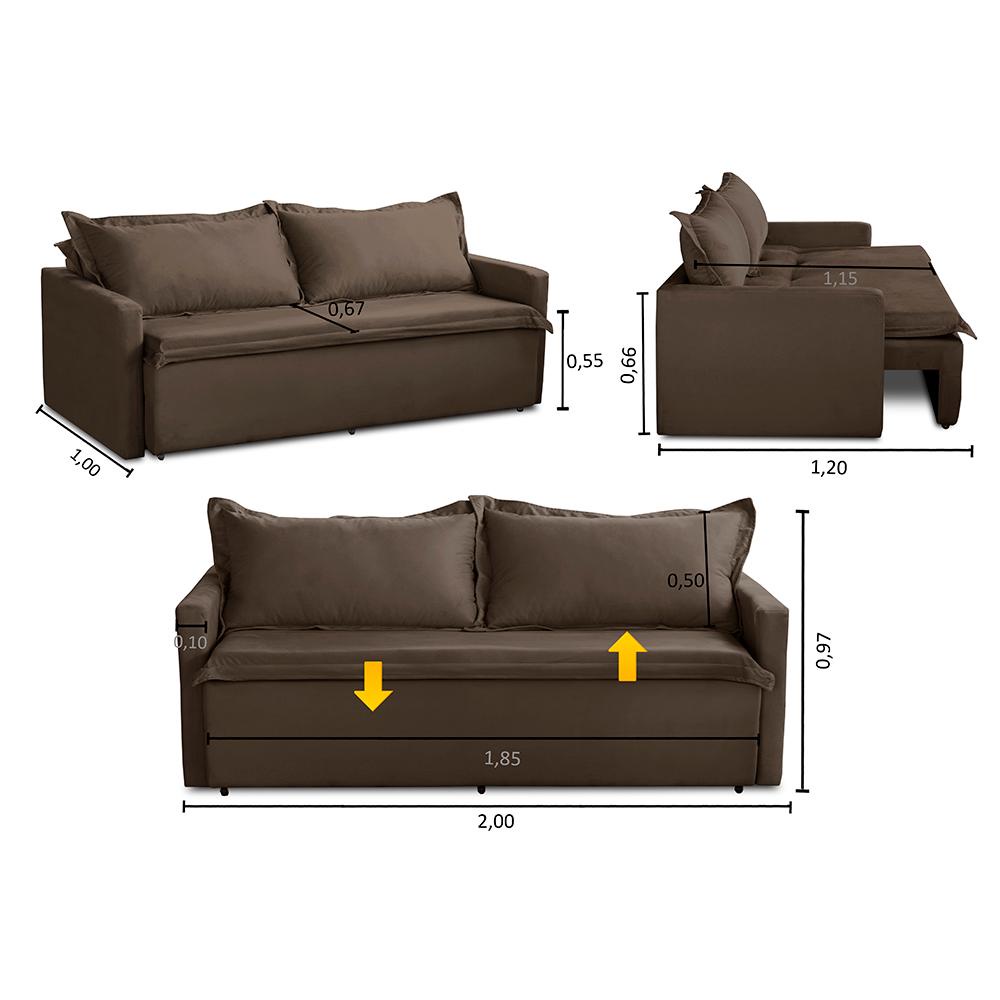 Sofá Sem Caixa Retrátil e Reclinável Kiara possui uma funcionalidade inteligente, um design elegante, além de proporcionar o equilíbrio perfeito entre estilo e comodidade. Medidas do Produto Montado: - Largura: 2,00m - Altura: 0,97m - Profundidade total fechado: 1,00m - Profundidade total aberto: 1,20m - Largura de assento: 1,80m - Profundidade do assento fechado: 0,67m - Profundidade do assento como cama: 1,15m - Altura do assento ao final do encosto: 0,50m - Braço: 0,10m - Chão ao assento: 0,55m - Chão ao final do braço: 0,66m Especificações Técnicas: Encosto:Composto por 2 almofadas soltas com enchimento de 80% fibra e 20% flocos que proporcionam maciez e conforto. Assento:Composto pelo conjunto deMolas Bonnel, Espuma D-33 e percintas elásticas de 5mm que são esticadas por uma percintadeira, que garante a melhor qualidade para o conforto e durabilidade do assento. Estrutura:Sua estrutura é toda composta por madeira de eucalipto 100% reflorestada, fixada por grampos galvanizados que vão fazer todo o trabalho de manter uma estrutura firme, com alta qualidade e durabilidade. Informações relevantes: - Esse produto suporta de 130 a 150kg por assento. *Este produto vai embalado em 1 Volume. Garantia 90 dias após o recebimento do produto. Instruções de limpeza:Utilizar um pano limpo e seco.Não limpe com escovas ou produtos abrasivos. Observações importantes: - As imagens são meramente ilustrativas, não acompanham objetos de decoração e eletros; - As cores dos produtos podem sofrer alterações dependendo do seu monitor, tela de celular ou lote do tecido. - Todos os produtos vão embalados com total segurança; - Confira a embalagem e o produto no ato da entrega, caso o produto esteja em desacordo recuse imediatamente. - Não nos responsabilizamos no ato de entrega por montagens, desmontagens, instalações de produtos, nem uso de guinchos ou equipamentos para acesso a pisos superiores em apartamentos. - Confira as dimensões do produto no momento da compra e certifique-se de que passará por escadas, elevadores, portas e corredores. Observando as orientações acima, evita-se futuros desagrados ou imprevistos com a entrega do produto. CASO TENHA, A MONTAGEM DO PRODUTO É DE RESPONSABILIDADE DO COMPRADOR, NÃO EFETUAMOS A MONTAGEM DO PRODUTO. *As transportadorasNÃO SOBEMescadas, elevadores e não adentram residências* - A entrega será feita até a porta ou portaria do endereço no qual o pedido foi feito, qualquer necessidade de movimentação do produto até o local onde ele será utilizado é de inteira responsabilidade do CLIENTE, caso haja algum dano ou qualquer coisa do tipo no produto durante a movimentação NÃO NOS RESPONSABILIZAMOS.