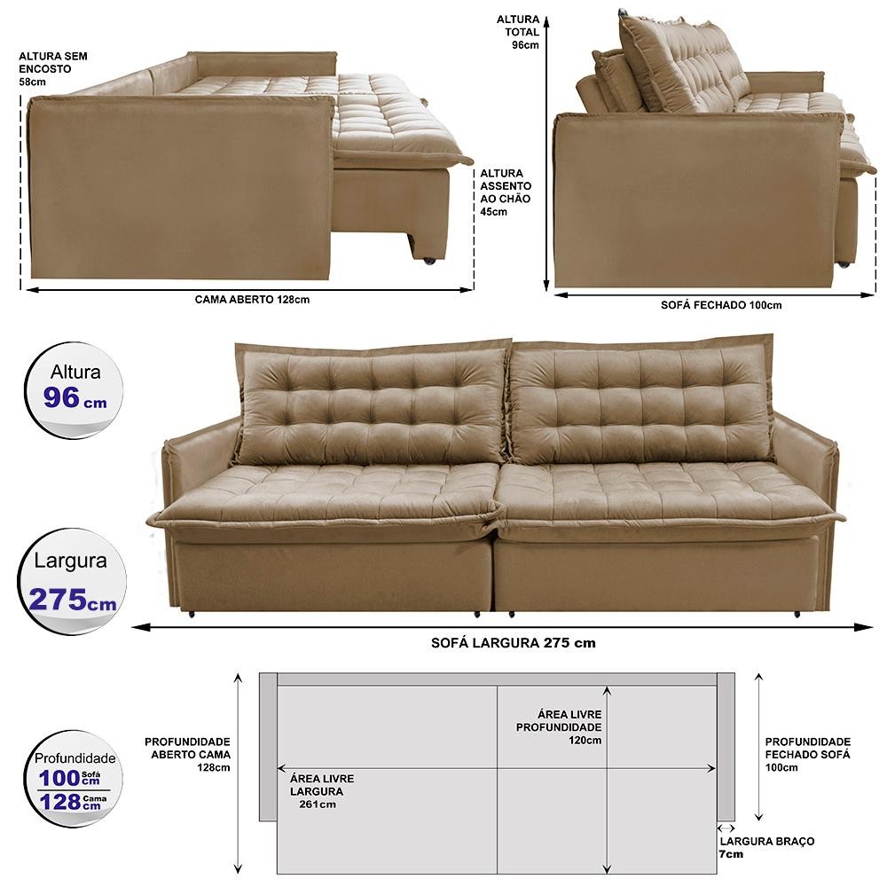 Sofá Sem Caixa Retrátil Reclinável 2,75m Cama inBox Versátil com Pillow Top e Molas Velusoft Bege
