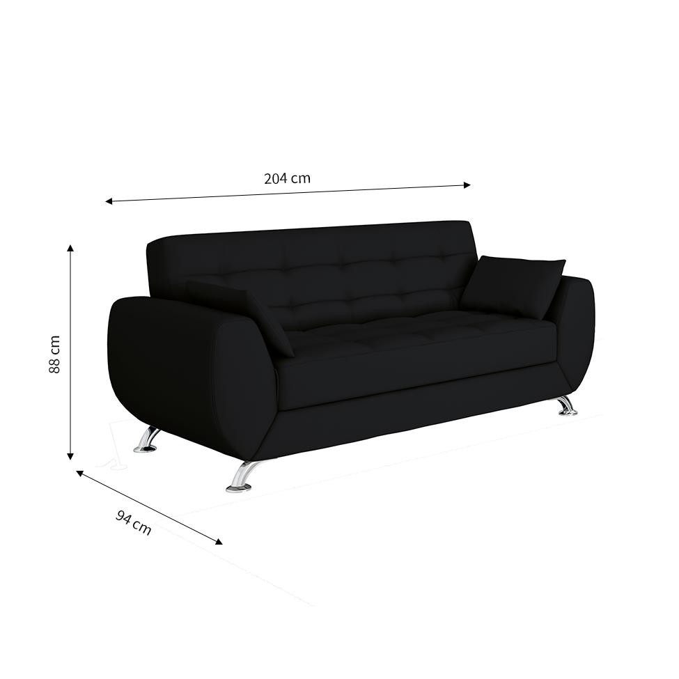 Que tal o Sofá Larissa?A sua sala de estar só está completa na presença de um bom sofá e nada mais gostoso do que receber a família ou curtir os seus momentos de descanso junto com o modelo Larissa! Pensado para quem quer aliar bom gosto + uma estrutura reforçada para o uso diário, a peça tem madeira reflorestada na composição e revestimento de toque agradável com o corpo para garantir que a receptividade seja plena. Já o visual elegante de coloração tradicional a esse tipo de móvel fecha com chave de ouro os benefícios que ele oferece para o seu doce lar ;) Cor: Preto Garantia em Meses: 3 Cores do Produto: Preto Instruções/Cuidados: Limpar com pano úmido com água. Conteúdo da Embalagem: 1 Sofá (Acompanha 2 almofadas) - Entregue em: 1 Volume Modelo: Comum Número de Volumes: 1 Material: O sofá Larissa tem sua estrutura em madeira reflorestada (eucalipto e pinus) e chapa OSB, com enchimento do assento em espuma D33 e encosto em D23, já o revestimento é revestimento sintético. Material para Filtro: Madeira de Reflorestamento Descrição do Tamanho: Altura: 88 cm | Largura: 204 cm | Profundidade: 94 cm Altura do Produto (cm): 88 Largura do Produto (cm): 204 Comprimento do Produto (cm): 94 Peso do Produto (Kg): 37 Produto precisa de Montagem?: Não Tipo de Encosto: Fixo Quantidade de Peças: 1 Tipo de pé: Fixo Altura do assento até o chão (cm): 46 Acompanha banco/puff: Não É giratório: Não Material da estrutura: Madeira de Reflorestamento Material do enchimento do assento: Espuma D33 Material do enchimento do encosto: Espuma D23 Material do Revestimento: Revestimento Sintético Possui Baú?: Não Tipo de assento: Fixo PROFUNDIDADE x LARGURA x ALTURA: 94 x 204 x 88 Fornecedor: Linoforte Móveis Ltda É com chaise: Não Tipo de produto: Sofá É sofá-cama: Não É de canto: Não Certificação de teste externa: Não Baterias são necessárias?: Não Componentes incluídos: Não Is Fragile: Não Número da peça: Não Produto: Sofá É reclinável: Não Quantidade de lugares: 3 Tipo do Sofá: null Inclui manual de montagem: Não