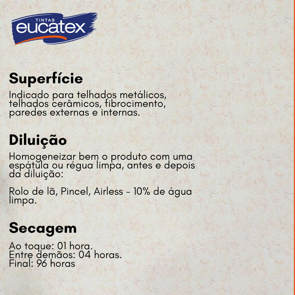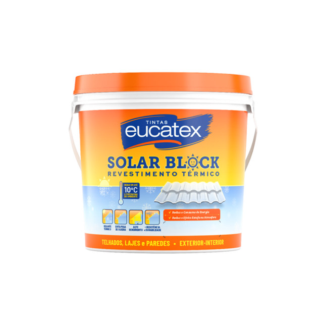 Solar Block Manta Liquida Reduz Até 10° A Menos Do Calor 1 6 Acabamento Fosco Cor Branco ..................................................................................................................................... INFORMAÇÕES SOBRE O PRODUTO ..................................................................................................................................... O Eucatex Solar Block é um revestimento acrílico isolante com função de reduzir a temperatura por reflexão e barreira. Tem alto desempenho, durabilidade, baixa pega de sujeira, é flexível e resistente à intempéries. Em testes em nossos laboratórios reduz a temperatura interna em até 10°C, em dia quentes e de alta insolação. ..................................................................................................................................... ESPECIFICAÇÕES DO PRODUTO ..................................................................................................................................... Superfície: Indicado para telhados metálicos, telhados cerâmicos, fibrocimento, paredes externas e internas. Diluição: Homogeneizar bem o produto com uma espátula ou régua limpa, antes e depois da diluição: Rolo de lã, Pincel, Airless - 10% de água limpa. Rendimento: Balde - 16Kg: Até 200m² Embalagem: Balde 16kg Demãos: 3 demãos Secagem: Ao toque: 01 hora. Entre demãos: 04 horas. Final: 96 horas. Aplicação: Rolo de lã de pelo alto Pincel Airless Dicas e Preparação da Superfície: ABNT NBR 13245 – A superfície deve estar em bom estado (firme coesa, limpa, seca, sem poeira, gordura, graxa, sabão ou mofo). Com partes soltas ou mal aderidas: Devem ser raspadas ou escovadas até completa remoção e em seguida aplicar EUCATEX FUNDO PREPARADOR ou DUE PRO 300. Aguardar a secagem e aplicar 3 demãos do EUCATEX SOLAR BLOCK. Mofadas: Remover as placas de mofo. Aplicar EUCATEX ZERO MOFO, aguardar a secagem do produto e aplicar 3 demãos do EUCATEX SOLAR BLOCK. Com manchas de óleo e gordura: Lavar com solução de água e detergente neutro, enxaguar e aguardar a secagem. Aplicar 3 demãos do EICATEX SOLAR BLOCK. Telhas galvanizadas novas: Aplicar 3 demãos do EUCATEX SOLAR BLOCK. Nos parafusos de travamento do telhado recomendamos o uso do EUCATEX ULTRA VEDA TUDO. Telhas galvanizadas antigas: Devem ser lavadas para retidas de resíduos. Aguardar a secagem e pintar. Telhas com ferrugem deverão ser lavadas, e, a ferrugem, tratada com EUCATEX ZERO FERRUGEM. Aguardar a secagem e aplicar 3 demãos do EUCATEX SOLAR BLOCK. Nos parafusos de travamento das telhas recomendamos o uso de EUCATEX ULTRA VEDA TUDO. Telhas cerâmicas: Lavar a superfície de modo que ela fique isenta de quaisquer contaminastes. Secar e aplicar 3 demãos do EUCATEX SOLAR BLOCK. Nos parafusos de travamewnto recomendados o uso do EUCATEX ULTRA VEDA TUDO. Paredes externas e internas: Aplicar uma demão do EUCATEX FUNDO PREPARADOR ou DUE PRO 300. Aguardar a secagem e aplicar 3 demãos do EUCATEX SOLAR BLOCK. Fibrocimento telhado antigo: Deverá ser hidrojateado e aguardar secagem. Recomendamos a aplicação de Infinity Bond Grafeno Promotor de aderência. Aguardar a secagem aplicar 3 demãos do EUCATEX SOLAR BLOCK. Fibrocimento telhado antigo: Lavar e aguardar a secagem e pintar. Nos parafusos de travamento das telhas recomendamos o uso do EUCATEX ULTRA VEDA TUDO. Observações: 1. Homogeneíze sempre a tinta, mecanicamente, com furadeira e haste de baixa rotação, antes e depois da diluição 2. Recomendamos o mínimo de 3 demãos do produto para que seja eficaz. 3. Respeite sempre a diluição máxima de 10%, pois excesso de diluição afeta a performance do produto. 4. Não deve ter exposição à chuva antes de 24 horas e empoçamento antes de 48 horas após a aplicação. 5. Aplicações em superfícies quentes devem ser aplicadas em horários matutinos. 6. Evitar de aplicar o produto em dias chuvosos, temperatura abaixo de 10ºC ou acima de 30ºC e umidade acima de 90%. 7. Depois de usar a tinta descartar a embalagem em pontos de coletas especiais. 8. Depois do produto aberto deve-se guarda-lo bem fechado por até 6 meses. Sujestão usa-lo em outra pintura ou doa-lo. DÚVIDAS FREQUENTES Pergunta: Como é embalado o produto? Resposta: Todos os nossos produtos vendidos são embalados em caixas lacradas ou plástico stretch. Em respeito ao meio ambiente 90% das caixas são reutilizadas. Pergunta: Quem faz a entrega? Resposta: A entrega é terceirizada, feita via CORREIOS ou TRANSPORTADORA. Pergunta: O envio é feito em quantos dias? Resposta: Nós enviamos o seu pedido no prazo máximo de 24 horas após a confirmação de sua compra, sendo um dos envios mais rápidos da plataforma. Pergunta: Os produtos são novos ou usados? Resposta: Todos os produtos que trabalhamos são novos e com qualidade garantida.