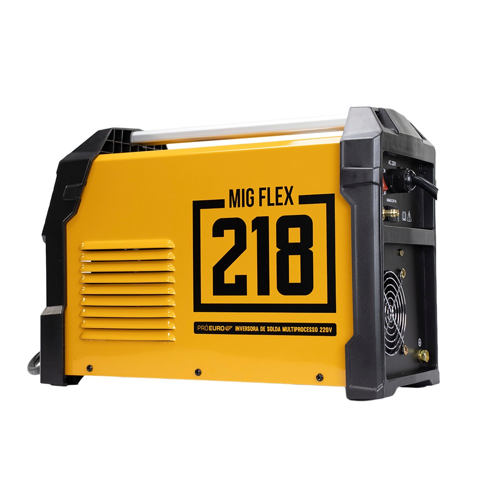 MIG 218A FLEX PRÓ EURO - 220V (Multiprocesso) São 4 máquinas em 1: MIG, MAG, MMA e TIG-LIFT; Possui função HOT START (Facilita o arco da solda e garante melhor qualidade); Aceita arames com ou sem gás e grande variedade de eletrodos. Eletrodos aceitos: - 6010 e 6013 de 2,5mm, 3,25mm e 4mm; - 7018 de 2,5mm, 3,25mm, 4mm e 5mm; - Ferro Fundido de 2,5mm e 3,25mm; - Inox 3080I. Solda SEM PARAR com eletrodo E6013 3,25mm. Arames aceitos: Rolos de 1 kg a 5 kg; De 0,6mm a 1,0mm; Com e sem gás. Ciclo de trabalho: MIG e MMA: 145A - 100%; 218A - 85%. Acompanha: Tocha Mig; Grampo terra; Porta eletrodo; Escova. Informações técnicas: 220V; Ajustes de corrente: 40A a 218A; Fase elétrica: monofásica 220V; Potência nominal: 6,6KVA; Tensão em vazio: MMA - 28VDC / MIG - 25VDC; Frequência: 50/60Hz; Grau de Proteção Máxima: IP 21S; Conector engate rápido: 9mm; Eficiência Máxima: 90%; Peso 8,7 Kg; Medidas: C45 x L20 x A31. Máscara Solda Automática 3 Regulagens 8k Pró Euro Com função True Color e Esmerilhar. Três regulagens: Escurecimento, Sensibilidade e Delay; Nível de escurecimento: DIN 5 até 9 e 9 até 13; Campo de visão amplo possibilitando total visibilidade: 100x97mm; Bateria removível; Regulagem na alça, ajustando para todos os tamanhos de cabeça; Com indicador de bateria baixa; Peso: 0,53Kg. Garantia da Máscara de Solda: 03 meses.