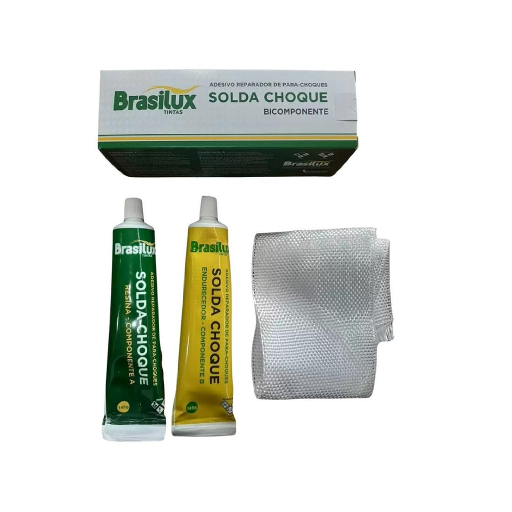 Solda Choque Brasilux 300gr - Adesivo Epóxi Bicomponente Componente A 145gr Componente B 145gr Manta 10gr Manta: Comprimento 50cm / largura: 10cm Descrição:Adesivo a base de epóxi poliamida pigmentado com cargas e pigmentos especiais. livre desolventes(V.O.C FREE) COMPOSIÇÃO DO KIT:COMPONENTE A SC 8705378COMPONENTE B ED 8700563 MANTA DE NYLON Uso e Aplicações: Indicado para reparos em para choques ,artefatos, peças plásticas, grades e fibras de vidroem geralDiluente/Catálise: Catalisado na proporção por volume de 1 parte do componente A para 1 parte docomponente B (1x1)Teor de Sólidos: Por Peso: 100% Formas deAplicação: Espátula de silicone, metálica ou de poliuretano.Instruções Gerais:PREPARO DE SUPERFÍCIE:As superfícies deverão estar secas e limpas, isentas de pó, oleosidades, graxas e partículassoltas. Superfícies como plásticos, pedras, cerâmicas deverão ser lixados.É permitido um ligeiro lixamento com lixa 320 MODO DE PREPARO DO PRODUTO:Misturar o componente A com o componente B na proporção por volume de 1x1, efetuandoperfeita homogeneização com auxílio de espátula, resultando em uma massa uniforme.Após a mistura, o produto deve ser consumido por completo em até 1 hora APLICAÇÃO:Aplicar o adesivo alternando camadas de adesivo e a manta de fibra com o auxilio de espátula.A secagem do adesivo à temperatura ambiente se dá após 2 horas e a cura total 24 horas.Para a pintura e repintura recomendamos que seja feita a secagem ao ar sem que o processoseja submetido a temperaturas para acelerar. Rendimento teórico: Depois de misturado componente A + componente B = 1,75 kilos/m2 /mm Densidade: 1,600 a 1650 g/cm3
