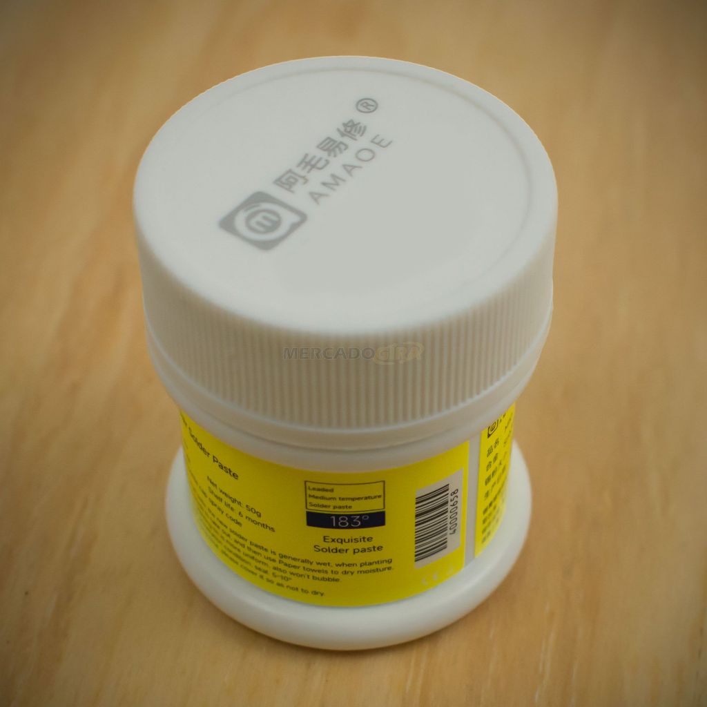 Solda em pasta usada para soldagem e retrabalho de componentes eletrônicos. Ideal para BGA, SMT, reparos em placas de celular, notebooks e outros dispositivos. Funde com precisão ao ser aquecida com soprador térmico, alcançando locais onde o estanho comum não chega. Modelos: - M10: Ponto de fusão 183 °C / Sn63Pd37. - M11: Ponto de fusão 138 °C / Sn42Bi58. Conteúdo: - 1 pote com 50g (modelo conforme selecionado). Marca: - Amaoe.