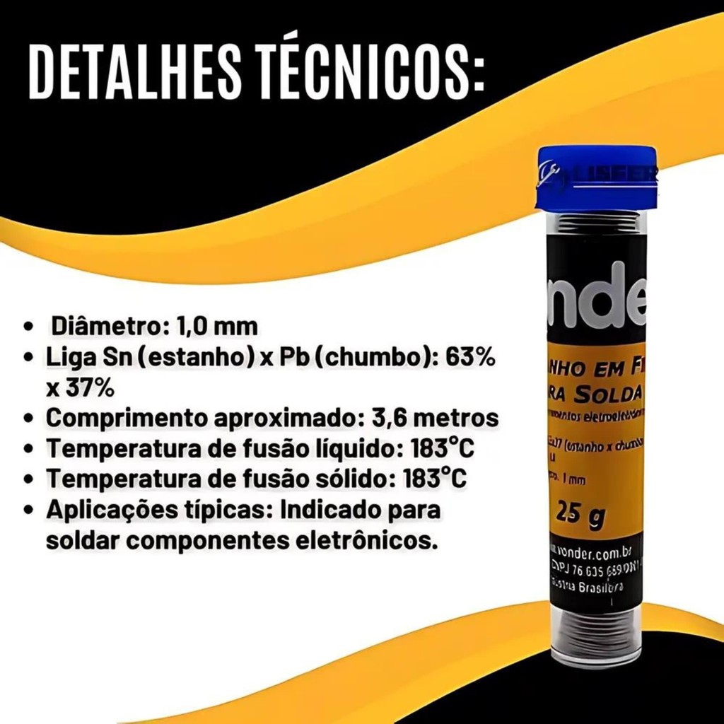 | Solda Estanho Fio 1mm 63x37 Tubinho 25g Vonder - 7438633715 este produto | R$ 25,00 | — | 4.9/5 | — |