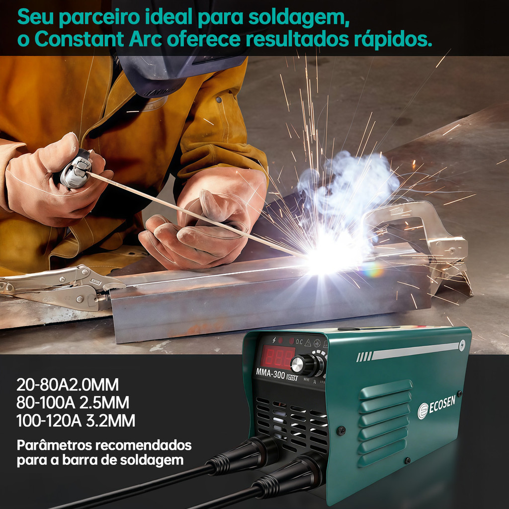 MAQUINA DE SOLDA ELETRICA INVERSORA COM VISOR DIGITAL 120A A Máquina Inversora de Solda 120A possui tecnologia moderna e avançada, sendo ideal para serviços de solda em montagens e reparos de estruturas metálicas em geral; Compacta e leve, permite obter acabamento profissional. VANTAGENS: - Equipamento leve e pequeno, facilita o trabalho em locais de difícil acesso ou em altura elevada; - Possui visor digital para melhor visualização do trabalho exigido; - Solda aço, aço carbono, entre outros metais ferrosos. CARACTERISTICAS: - Solda MMA (Eletrodo) e também TIG, porém não acompanha tocha; - Funções: Hot Start, Ark Force e Anti Stick; - Não solda MIG. DIMENSÕES DOS CABOS: - Cabo de força (tomada): 1,50Mt; - Porta eletrodo e garra: 1,14Mt. ITENS INCLUSOS: - Alça para transporte; - Cabo Porta Eletrodo; - Fonte Inversora; - Inversora.