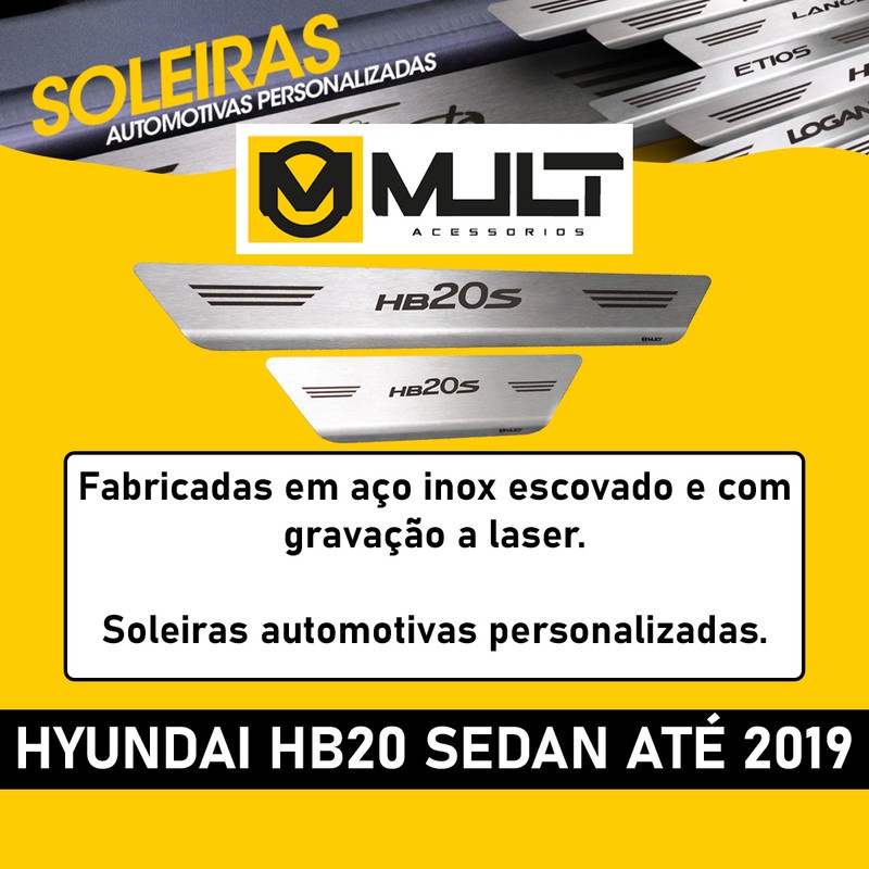 Kit Soleira Mult Aço Inoxidável Fita 3M Personalizada Contra Riscos - Hyundai HB20 Sedan - Até 2019 Soleira fabricada em aço inoxidável, super resistente e não enferruja. Instalação fácil, pode ser feita em casa sem algum especialista. A fixação é personalizada, feita com fita 3M Especial, que não altera a espessura da Soleira, garantindo excelente durabilidade sem causar danos no veículo. A Soleira protege contra riscos, além de proporcionar um visual personalizado para o automóvel, fabricado sob medida pra cada veículo com alto padrão de tecnologia e matéria prima. * MODO DE INSTALAÇÃO * • 1 - Remova qualquer impureza na área da superfície que será aplicado o produto. Lave com água e sabão e não esqueça de certificar-se de que o local esteja bem seco. • 2 - Descole os adesivos que se encontra na parte traseira da soleira e centralize na soleira do carro. * CUIDADOS COM O PRODUTO * • Utilize apenas água e sabão neutro e/ou automotivo para limpeza do produto • Na utilização de esponja para a limpeza, não utilize a parte ""ABRASIVA"" • Não lave a área onde foi instalado o adesivo por um período de 24 horas [ESPECIFICAÇÕES] • Identificação do Modelo do carro em cada Soleira • Sem rebarbas por ter sido cortado a laser • Fabricado em aço inox escovado de 0,6mm de alta qualidade • Fixação por fita dupla-face 3M • Alta resistência [CONTEÚDO DA EMBALAGEM] • 2 Soleiras Dianteiras • 2 Soleiras Traseiras [COMPATIBILIDADE] • Hyundai HB20 Sedan - Até 2019 [DÚVIDAS FREQUENTES] • Os produtos são novos? R: Só trabalhamos com produtos novos e com garantia. • Como funciona a garantia? R: Nossos produtos têm uma etiqueta de garantia para nosso controle interno, com essa etiqueta verificamos se o produto é nosso mesmo, portanto NÃO tire a etiqueta do produto. • O produto está disponível a pronta entrega? R: Sim, todos os nossos produtos estão no nosso estoque preparado para ser embalado e enviado pra você! Ficou alguma dúvida? Esclareça sua dúvida no chat! Ficamos à disposição para esclarecer qualquer dúvida que tenha surgido, faça sua pergunta no chat, vamos lhe atender com o maior prazer!