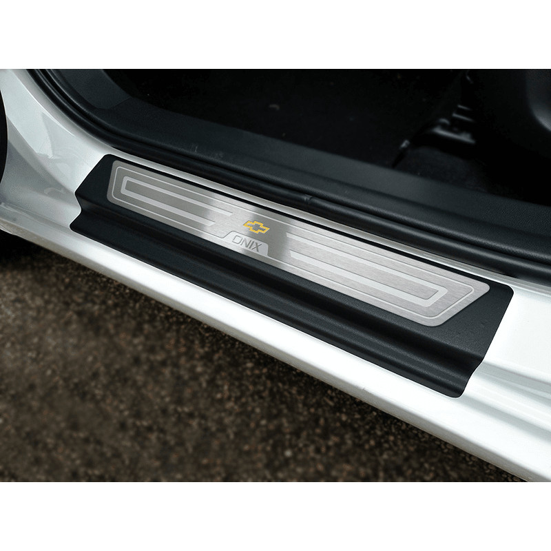 Gravação em relevo antiderrapante; Protege contra arranhões; Modelagem sob medida; Aparência esportiva e personalizada; Instalação simples feita em minutos; Vinil flexível que cobre mesmo bordas e ondulações; Vinil com acabamento anti-riscos; ITENS INCLUSOS: 2 soleiras para portas dianteiras 2 soleiras para portas traseiras 2 soleiras vinil para portas dianteiras 2 soleiras vinil para portas traseiras DESCRIÇÃO: Ao entrar e sair do veículo você, ou seus passageiros, acabam encostando os pés na área da soleira da porta. Isto acaba deixando riscos e arranhões na soleira do seu Onix, fazendo com que esta seja uma das áreas de mais rápido desgaste no veículo. Pensando em solucionar este problema foi desenvolvida o protetor de soleira. Ele será instalada protegendo uma boa área da soleira, evitando que sofra desgastes. Você e seus passageiros poderão entrar e sair do seu carro sem preocupar-se ao pisar no local da soleira. O protetor de soleira também agrega estilo para seu Onix. Ele conta com gravação personalizada em alto relevo, detalhes pintados na cor preto e rico acabamento escovado que protege contra arranhões. Fabricado em inox o protetor de soleira não enferruja ou perde o brilho. Devido ao seu material ele mantém aparência de novo por mais tempo. Esta peça também tem maior resistência ao atrito com os pés. Você mesmo pode fazer a instalação do seu protetor de soleira de portas. A área de aplicação é 100% autocolante o que elimina a possibilidade da entrada de sujeira por baixo da peça. VEÍCULOS COMPATÍVEIS: Chevrolet: • Onix 2013 todas as versões • Onix 2014 todas as versões • Onix 2015 todas as versões • Onix 2016 todas as versões • Onix 2017 todas as versões • Onix 2018 todas as versões • Onix 2019 todas as versões DADOS TÉCNICOS SOLEIRA: Matéria prima: aço inox 430; Espessura: 0,5 mm; Acabamento: escovado; Fita dupla face: 3M VHB; DADOS TÉCNICOS VINIL: Matéria prima: vinil auto-colante; GARANTIA: 1 ano