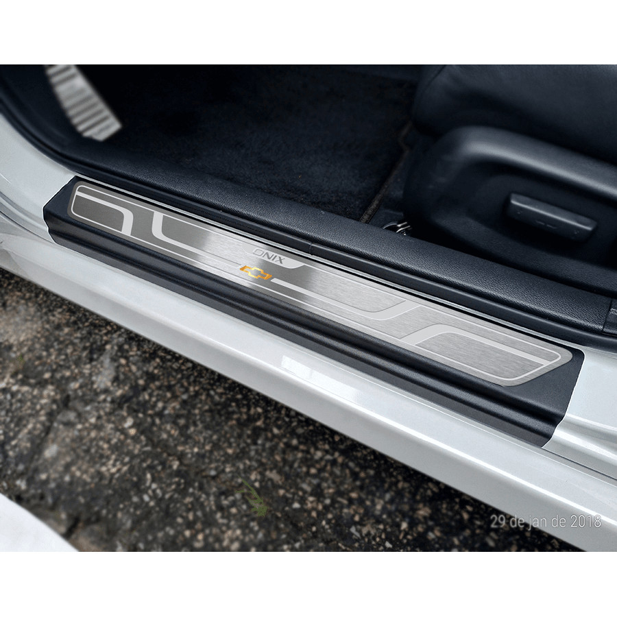 Gravação em relevo antiderrapante; Protege contra arranhões; Modelagem sob medida; Aparência esportiva e personalizada; Instalação simples feita em minutos; Vinil flexível que cobre mesmo bordas e ondulações; Vinil com acabamento anti-riscos; ITENS INCLUSOS: 2 soleiras para portas dianteiras 2 soleiras para portas traseiras 2 soleiras vinil para portas dianteiras 2 soleiras vinil para portas traseiras DESCRIÇÃO: Ao entrar e sair do veículo você, ou seus passageiros, acabam encostando os pés na área da soleira da porta. Isto acaba deixando riscos e arranhões na soleira do seu Onix, fazendo com que esta seja uma das áreas de mais rápido desgaste no veículo. Pensando em solucionar este problema foi desenvolvida o protetor de soleira. Ele será instalada protegendo uma boa área da soleira, evitando que sofra desgastes. Você e seus passageiros poderão entrar e sair do seu carro sem preocupar-se ao pisar no local da soleira. O protetor de soleira também agrega estilo para seu Onix. Ele conta com gravação personalizada em alto relevo, detalhes pintados na cor preto e rico acabamento escovado que protege contra arranhões. Fabricado em inox o protetor de soleira não enferruja ou perde o brilho. Devido ao seu material ele mantém aparência de novo por mais tempo. Esta peça também tem maior resistência ao atrito com os pés. Você mesmo pode fazer a instalação do seu protetor de soleira de portas. A área de aplicação é 100% autocolante o que elimina a possibilidade da entrada de sujeira por baixo da peça. VEÍCULOS COMPATÍVEIS: Chevrolet: • Onix 2020 todas as versões Posição: Dianteira • Onix 2021 todas as versões Posição: Dianteira • Onix 2022 todas as versões Posição: Dianteira • Onix 2023 todas as versões Posição: Dianteira • Onix 2024 todas as versões Posição: Dianteira • Onix 2025 todas as versões Posição: Dianteira DADOS TÉCNICOS SOLEIRA: Matéria prima: aço inox 430; Espessura: 0,5 mm; Acabamento: escovado; Fita dupla face: 3M VHB; DADOS TÉCNICOS VINIL: Matéria prima: vinil auto-colante; GARANTIA: 1 ano