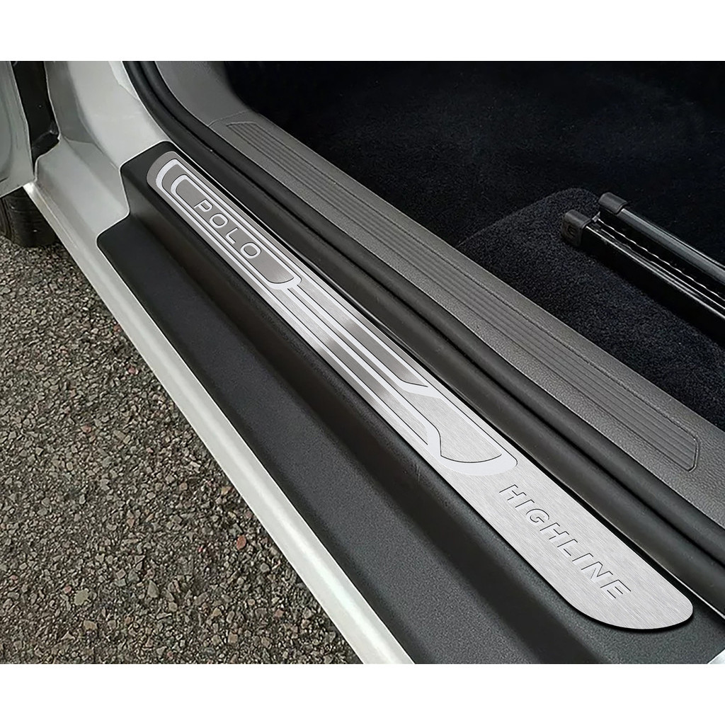 Gravação em relevo antiderrapante; Protege contra arranhões; Modelagem sob medida; Aparência esportiva e personalizada; Instalação simples feita em minutos; Vinil flexível que cobre mesmo bordas e ondulações; Vinil com acabamento anti-riscos; ITENS INCLUSOS: 2 soleiras para portas dianteiras 2 soleiras para portas traseiras 2 soleiras vinil para portas dianteiras 2 soleiras vinil para portas traseiras DESCRIÇÃO: Ao entrar e sair do veículo você, ou seus passageiros, acabam encostando os pés na área da soleira da porta. Isto acaba deixando riscos e arranhões na soleira do seu Polo Highline, fazendo com que esta seja uma das áreas de mais rápido desgaste no veículo. Pensando em solucionar este problema foi desenvolvida o protetor de soleira. Ele será instalada protegendo uma boa área da soleira, evitando que sofra desgastes. Você e seus passageiros poderão entrar e sair do seu carro sem preocupar-se ao pisar no local da soleira. O protetor de soleira também agrega estilo para seu Polo Highline. Ele conta com gravação personalizada em alto relevo, detalhes pintados na cor preto e rico acabamento escovado que protege contra arranhões. Fabricado em inox o protetor de soleira não enferruja ou perde o brilho. Devido ao seu material ele mantém aparência de novo por mais tempo. Esta peça também tem maior resistência ao atrito com os pés. Você mesmo pode fazer a instalação do seu protetor de soleira de portas. A área de aplicação é 100% autocolante o que elimina a possibilidade da entrada de sujeira por baixo da peça. VEÍCULOS COMPATÍVEIS: Volkswagen: • Polo 2023 todas as versões Posição: Dianteira • Polo 2024 todas as versões Posição: Dianteira • Polo 2025 todas as versões Posição: Dianteira DADOS TÉCNICOS SOLEIRA: Matéria prima: aço inox 304; Espessura: 0,5 mm; Gravação: química em relevo; Fixação: fita dupla face 3M; DADOS TÉCNICOS VINIL: Matéria prima: vinil auto-colante; GARANTIA: 1 ano