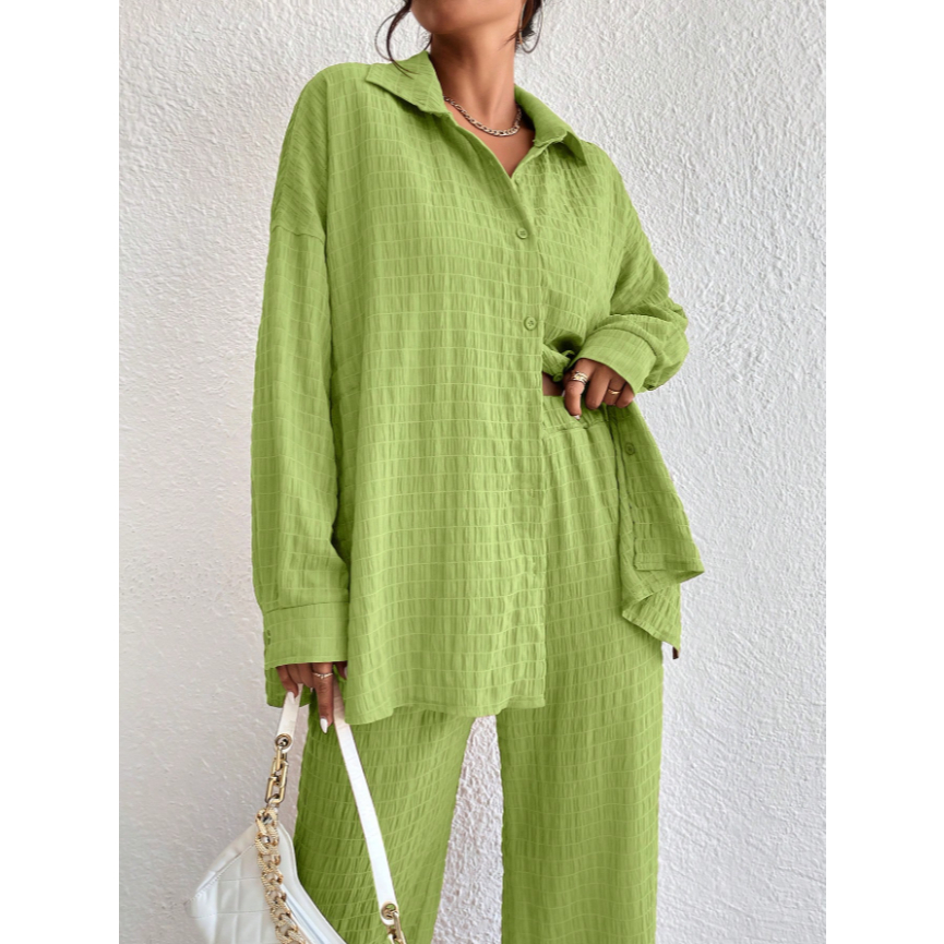 Descrição do Produto: Camisa e Calças: 📌 Este conjunto inclui uma camisa e calças, ambos com um design simples e elegante. Estilo: 📌 A camisa apresenta um ombro caído, enquanto as calças possuem pernas largas. Detalhes: 📌 As peças são descritas como "Sólido," indicando que não há detalhes adicionais sobre cores ou estampas. Este produto oferece uma combinação de camisa e calças com especificações únicas: ombro caído na camisa e pernas largas nas calças. A simplicidade do design é destacada pelo termo "Sólido." Sem mais informações, esses são os principais atributos visíveis.