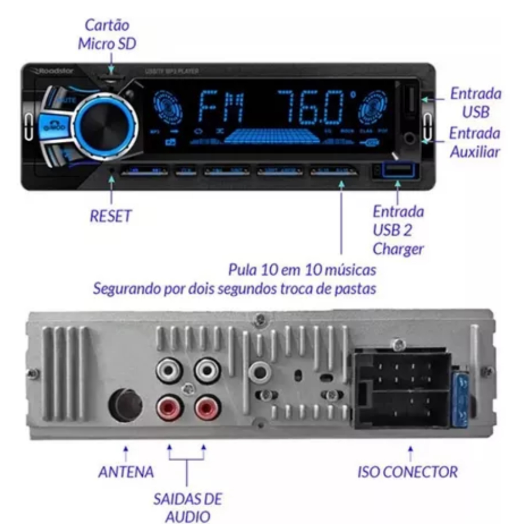 O som automotivo da Roadstar vai ser o seu melhor companheiro para aumentar o volume e desfrutar do caminho. Sempre pronto para você mergulhar na música que mais gosta e com o melhor som. Os seus passeios de carro serão mais divertidos! PERGUNTAS FREQUENTES 1. Aceita controle de longa distância? R. Sim 2. Volume máximo? R. até o 40. 3. O led fica piscando ou mantém parado na cor disponível? R. O aparelho tem as duas opções deixar piscando nas 7 cores disponíveis ou configurar para ficar aceso em 1 cor somente. Informações Técnicas Painel: Fixo com botões em 7 cores de iluminação (azul, azul claro, branco, amarelo, vermelho, roxo e verde) Visor: LCD em 7 cores de iluminação (azul, azul claro, branco, amarelo, vermelho, roxo e verde) Rádio: FM (76~108 Mhz) com memória para 18 estações FM Controles: Graves, Agudos e Balanço dos Canais Conexões: Bluetooth Entradas: Micro SD, Auxiliar e 2 USB´s (1 Charger e 1 Player) Saídas: 4 RCA Tipo de Conector: ISO Controle Remoto: SIM (Físico e por aplicativo) Potência: 4 Canais de 60 Watts RMS Pula Músicas 10 em 10 / Pula Pasta (manter pressionado o botão até pular a pasta) Visor grande e colorido O RS-2751BR Plus possui um grande visor em LED com 7 cores de iluminação, assim como os botões, o que proporciona um layout que combina totalmente com o painel de seu carro. Conectividade O auto rádio RS-2751BR possui entrada frontal auxiliar, entrada frontal para cartão micro SD, 2 entradas frontais USB sendo uma para você escutar suas músicas preferidas pelo Pen Drive e outra para recarregar seu celular e conexão Bluetooth. Controle total em suas mãos Você pode controlar o auto rádio através do controle remoto que acompanha o aparelho*. Além disso, este modelo de auto rádio pode ser controlado também por aplicativo (via Bluetooth) através do programa CarLive disponível na APP STORE e no GOOGLE PLAY. Garantia 30 dias diretamente pela plataforma (devolução total do produto) Não insista!
