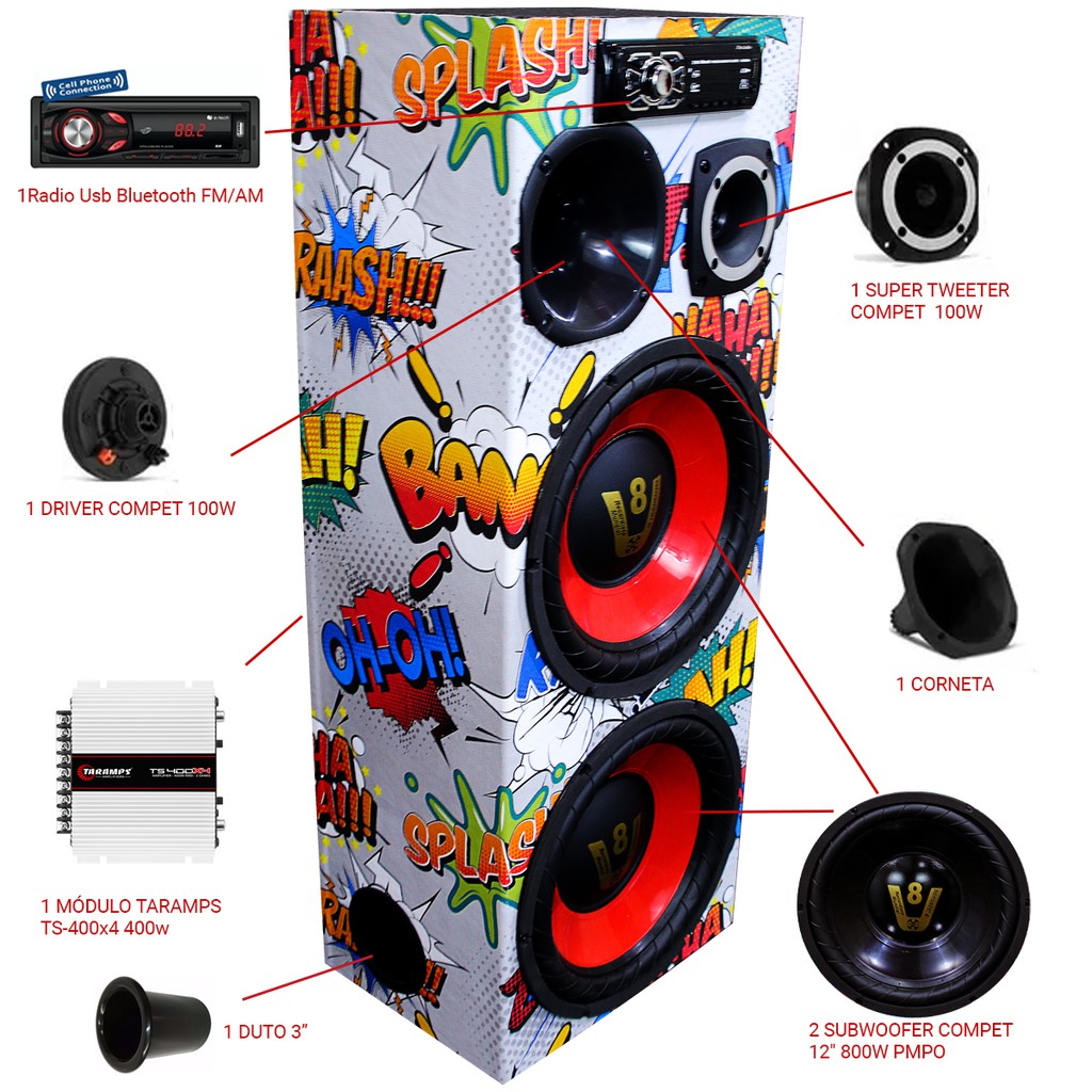 # OESTESOM # Com essa caixa você poderá ouvir todos os tipos de som com uma alta qualidade aliada a uma enorme potência sonora, através deste sistema você poderá reproduzir sons em todas as faixas de áudio. Reproduzindo entre 40Hz e 25000Hz, conseguindo assim uma qualidade incomparável. Acompanha o produto: 2 - Alto Falante Subwoofer Compet 800w Pmpo 1 - Modulo amplificador Taramps TS400x4 1 - Corneta e Driver 100w 1 - Radio Usb Bluetooth FM/AM 1 - Tweeter 100w 1 - Caixa MDF 1 - Fonte 12v Caixa pronta pra uso!!