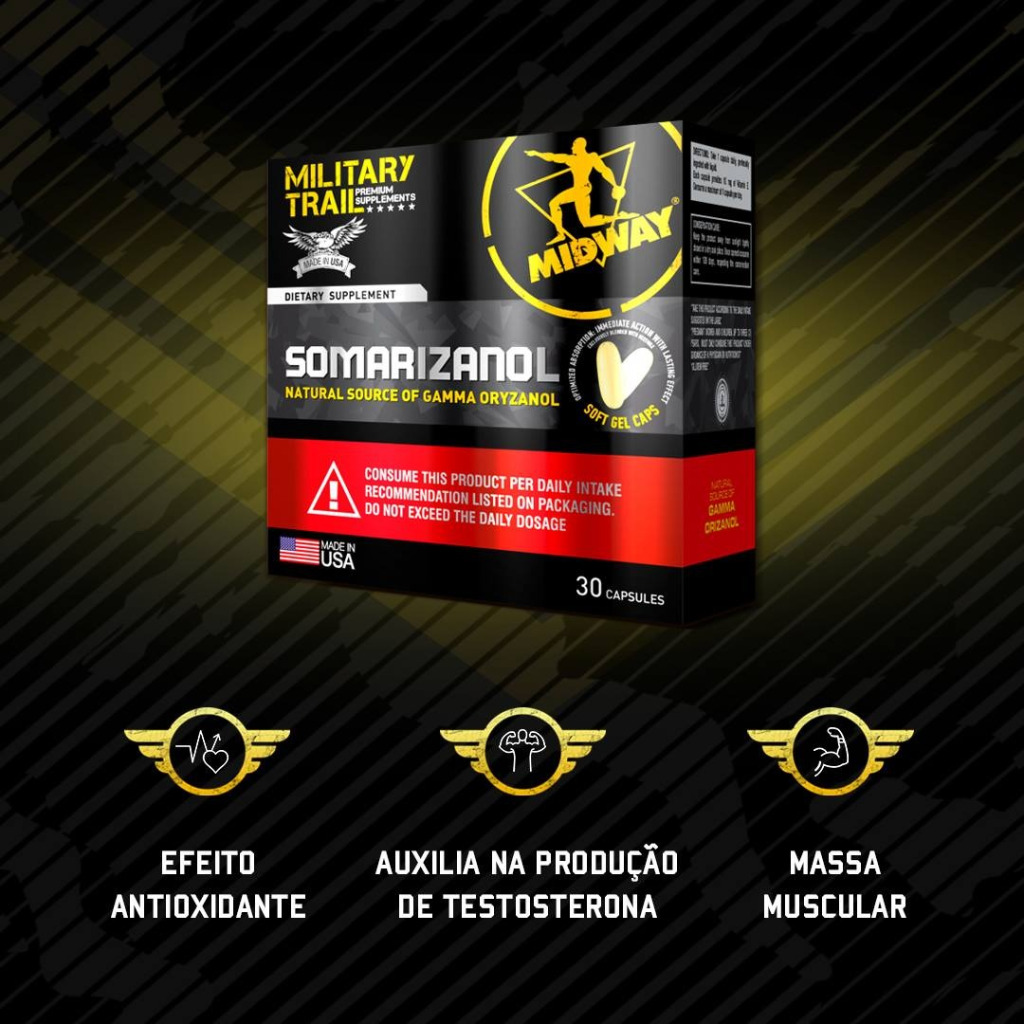 Está em busca de maior performance e resultados na academia? O Somarizanol é um suplemento que auxilia o corpo a produzir mais testosterona e GH, que são os hormônios responsáveis pela construção da massa muscular. Esses hormônios são estimulados pela alta concentração de Gamma Orizanol e vitamina E, que agem como antioxidante, promovendo melhora na recuperação muscular, muitas vezes prejudicada pela oxidação dos radicais livres, liberados durante o treino. Não fique parado e conte com os benefícios do Somarizanol da Military Trail! é um suplemento desenvolvido para auxiliar no desenvolvimento de massa muscular, desenvolvido com vitaminas e e minerais e gama orizanol, que associados auxiliam na produção da testosterona e otimiza seu aproveitamento pelo organismo, acelerando o crescimento muscular, aumentando a força e a energia, auxiliando no desenvolvimento da massa muscular. Ingredientes Vitamina E, veiculo óleo de arroz (oryza sativa-gamma oryzanol), glaceante cera de abelha, cápsula (veículos gelatina e glícerina).