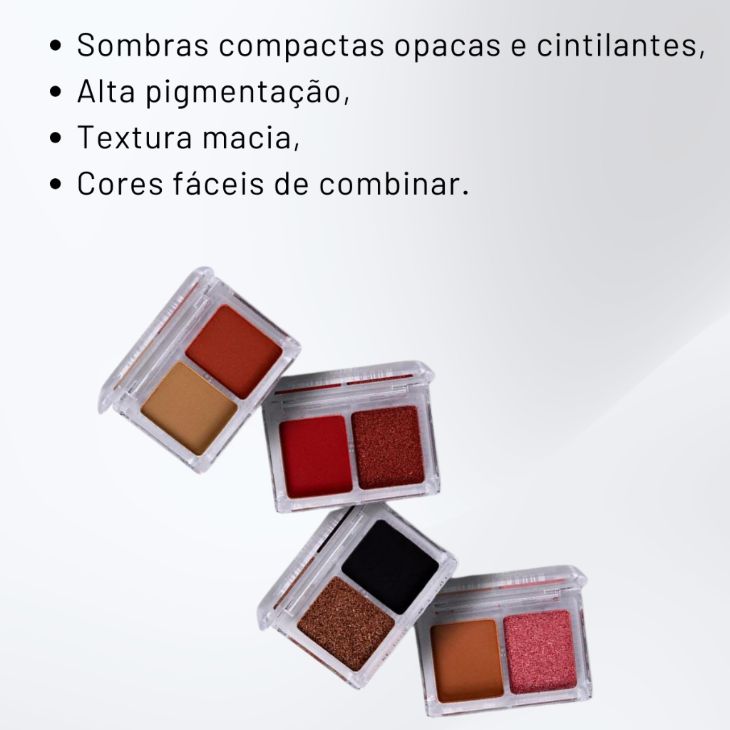 Sinta-se poderosa e confiante com a linha de maquiagens de Ana Hickmann. Produtos para rosto, olhos, boca e acessórios como esponjas, curvex, pincéis profissionais e kits. Produtos de alta performance. Seja a protagonista do seu próprio beauty show! Duo de sombras compactadas opacas e cintilantes. Cores pigmentadas e textura macia. Disponível em 4 duos. Modo de uso: Aplique na pálpebra com a ajuda de um pincel. Ingredientes: Ingredientes: Mica, Silica, Synthetic Fluorphlogopite, Polyethylene, Kaolin, Tridecyl Trimellitate, Caprylic/Capric Triglyceride, Magnesium Stearate, Simmondsia Chinensis Seed Wax (Jojoba), Tocopherol, Phenoxyethanol, Octyldodecanol, Ethylhexylglycerin, 1,2-Hexanediol. May Contain (+/-): CI 77491 (Iron Oxide Red), CI 15850 (Pigment Red 57), CI 77499 (Iron Oxide Black), CI 17200 (Acid Red 33). * Produto Vegano *