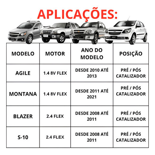SONDA LAMBDA / SENSOR DE OXIGENIO: CONTEÚDO DA EMBALAGEM: Código: 0258006827 Marca: Bosch Posição: Pré / Pós Catalisador Quantidade de Pinos: 4 Pinos Quantidade de Fios: 4 Fios Comprimento Total: 43 Cm APLICAÇÕES: Veículo: Agile Motor: 1.4 8v – Desde 2010 Até 2013 Veículo: Montana Motor: 1.4 8v - Desde: 2011Até 2017 Veículo: Blazer Motor: 2.4 – Flex – Desde 2008 Até 2012 Veículo: S10 Motor: 2.4 – Flex – Desde 2008 Até 2012 ANTES DE EFETUAR A SUA COMPRA, TIRE SUAS DUVIDAS NA ABA DE PERGUNTAS!