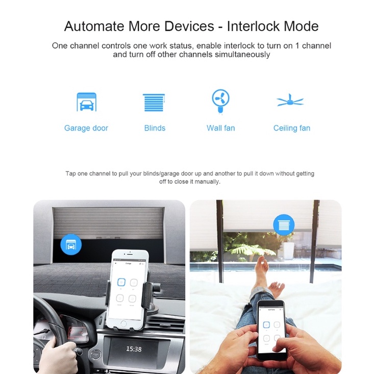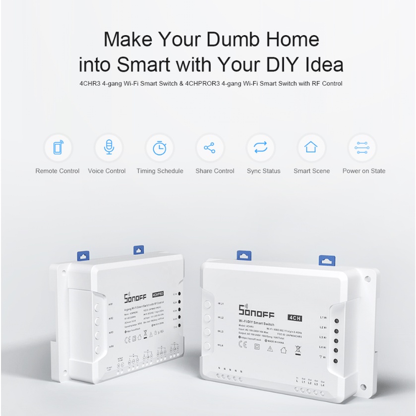 • Controle remoto de luzes ou dispositivos conectados através do APP • 3 modos de trabalho com modo de travamento automático, interlock e polegada para até mesmo porta de garagem de controle remoto e persianas de rolo • Suporte para agendar um temporizador para fazer os dispositivos começarem e pararem automaticamente o programação de um temporizador para fazer os dispositivos começarem e pararem parar de trabalhar • Personalize cenas inteligentes personalize cenas inteligentes para tornar o dispositivo conectado ao interruptor para desencadear outros dispositivos • Compartilhe a permissão de controle de dispositivos para outras contas para controlar juntos a permissão de controle de dispositivos • Verifique o status real-time on/OFF dos dispositivos no seu celular • O poder de ligação/manter para o estado permite que os usuários definam o status On/Off/Keep para o dispositivo conectado antes da falha de energia e certifique-se de permanecer o status organizado após a restauração de energia Observação POR FAVOR: O controle remoto 433MHz não está incluído, temos 4 teclas e 8 teclas, se você precisar delas, consulte outros links. Visão geral Sonoff 4CHPROR3 é um Interruptor Inteligente Wi-Fi de 4 gang DIY projetado para lhe dar a capacidade de integrar o controle inteligente em sua casa existente para permitir uma casa inteligente. Ao mesmo tempo em que cada interruptor inteligente tem 4 gangues que podem ser usados para controlar luzes e outros eletrodomésticos ao mesmo tempo em quatro áreas de sua casa. O RF 4CHPROR3 foi projetado com função adicional para controle RF. A função é adotada de forma propósito para fazer você ligar/desligar o dispositivo conectado com 4CHPROR3 através do controlador remoto RM433. Na verdade, a SONOFF já lançou dois tipos de interruptor inteligente de 4 gang (4CHR2 e 4CHPROR2.) que vem com quase mesmas funções com 4CHR3 e 4CHPROR3. Modo de travamento automático, mas todas as unidades acima ainda são diferentes em 3 modos de trabalho, incluindo modos de travamento automático, interlock e polegada. A nova melhoria em 4CHR3 e 4CHPROR3 em comparação com 4CHPR2 e 4CHPROR2 é para os usuários definirem esses 3 modos de trabalho no APP eWeLink em vez do próprio hardware, mais fácil de operar. Assim você pode permitir que o modo de travamento automático ligue/desligue 4 dispositivos conectados separadamente, modo interlock para ligar 1 dispositivo conectado toda vez e desligue o resto dos dispositivos simultaneamente e modo de polegada para ligar 1 Dispositivo conectado ao dispositivo e depois faça desligar automaticamente após um determinado tempo (0,5 - 3600s). A distância do aparelho do interruptor, você pode criar um espaço móvel em virtude de um trilho DIN para deixá-los longe do interruptor, você pode criar um espaço móvel em virtude de um trilho DIN para torná-los conectados. Basta ativar dispositivos através de sua voz quando o interruptor funciona com o assistente inteligente Alexa e Google Home. Especificação de especificação Faixa de tensão de tensão: 100-240V AC 50/60Hz (DC: 9-23V) Máx. Carga de carga: 10A/2200W/Gang 40A/8800W/Total Frequência sem fio: WiFi 2.4GHz Padrão sem fio IEEE802.11 b/g/n 2.4GHz(2400M-2483.5M); Mecanismo de segurança de redemoinho: WPA/WPA2 Material do Gabinete: Gabinete de Invólucro: PCV0 Turma do punho: 4 Dimensão: 145*90*34 (mm) Temperatura de operação (recomendada): -10oC-40oC(14°F-104°F) Umidade Operacional de Operação: 5%-95%RH, Não condensação Certificação 4CHPROR3: CE, FCC