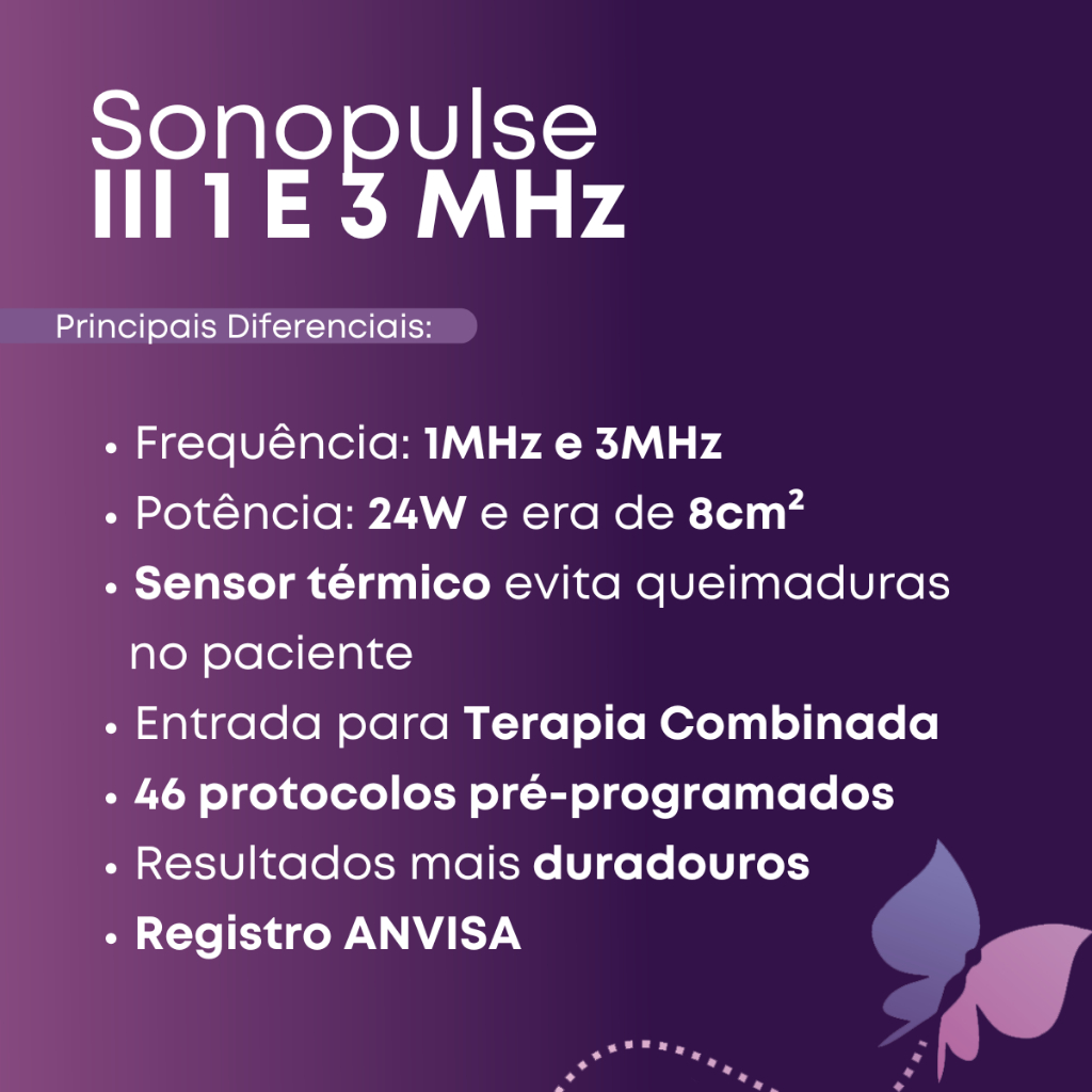 Sonopulse III – Aparelho de Ultrassom 1 e 3 MHz – Ibramed + Gel 1kg + Cubeta + Espátula O Sonopulse III é um equipamento de ultrassom terapêutico desenvolvido pela Ibramed para tratamentos estéticos e fisioterapêuticos. Opera nas frequências de 1 MHz e 3 MHz, permitindo terapias profundas ou superficiais com modo contínuo ou pulsado. Possui display moderno, protocolos pré-programados e transdutor ergonômico com ERA de 7 cm², garantindo aplicações seguras, precisas e eficazes. – DIFERENCIAIS DO SONOPULSE III > Frequências de 1 MHz (profundidade) e 3 MHz (superficial). > 46 protocolos programados + 20 particulares. > ERA de 7 cm², cobrindo área maior de aplicação. > Potência de 21 W. > Modo contínuo ou pulsado (100 Hz, 48 Hz ou 16 Hz | razões 50% e 20%). > Sensor térmico + desligamento automático. > Painel inclinado e display gráfico para melhor visualização. > Tratamento não invasivo, sem necessidade de recuperação. > Tecnologia microcontrolada e operação intuitiva. – INDICAÇÕES DO SONOPULSE III > 3 MHz – Estética / Dermatologia > Gordura localizada. > Celulite. > Pós-lipo e pós-abdominoplastia. > Fibroses. > Fonoforese. > 1 MHz – Fisioterapia > Tendinite. > Bursite. > Miosite. > Capsulite. > Lesão muscular. > Fraturas. > Recuperação pós-cirúrgica ortopédica. – MODOS DE USO > Modo Contínuo: promove efeito térmico e aumento da extensibilidade tecidual. > Modo Pulsado: reduz o calor, indicado para processos agudos. > Repetição de pulso: 100 Hz, 48 Hz ou 16 Hz. > Razões de pulso: 50% e 20%. – EFEITOS FISIOLÓGICOS > Estímulo químico e biológico. > Aumento da permeabilidade celular (fonoforese). > Efeito mecânico/micromassagem. > Cavitação estável/instável. > Aumento da oxigenação e fluxo sanguíneo. > Aumento da extensibilidade de colágeno. – DADOS TÉCNICOS > Marca: Ibramed > Modelo: Sonopulse III > Alimentação: Bivolt automático > Frequências: 1 MHz e 3 MHz > Potência: 21 W > ERA: 7 cm² (1 e 3 MHz) ou 3 cm² (1 MHz) > Dimensões: 26,5 × 29,4 × 10,8 cm > Peso: 1,1 kg > Registro Anvisa: 10360310015 > Garantia: 18 meses – ITENS INCLUSOS > 01 Sonopulse III – Ibramed > 01 Kit cabeçote de silicone com NTC > 01 Fusível de proteção > 01 Bisnaga de gel 100 g > 01 Cabo de força destacável > 01 Acesso ao manual digital * > 01 Gel 1KG – a marca será enviada conforme disponibilidade de estoque (Multigel ou RMC) > 01 Cubeta > 01 Espátula > 01 Clearmask APROVEITE! OFERTA POR TEMPO LIMITADO! DÚVIDAS? FAÇA SUA PERGUNTA ABAIXO! SERÁ UM PRAZER LHE ATENDER!