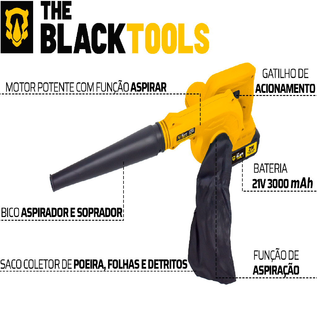 Soprador De Folhas A Bateria 21v Aspirador Com Saco Coletor Bivolt The Black Tools