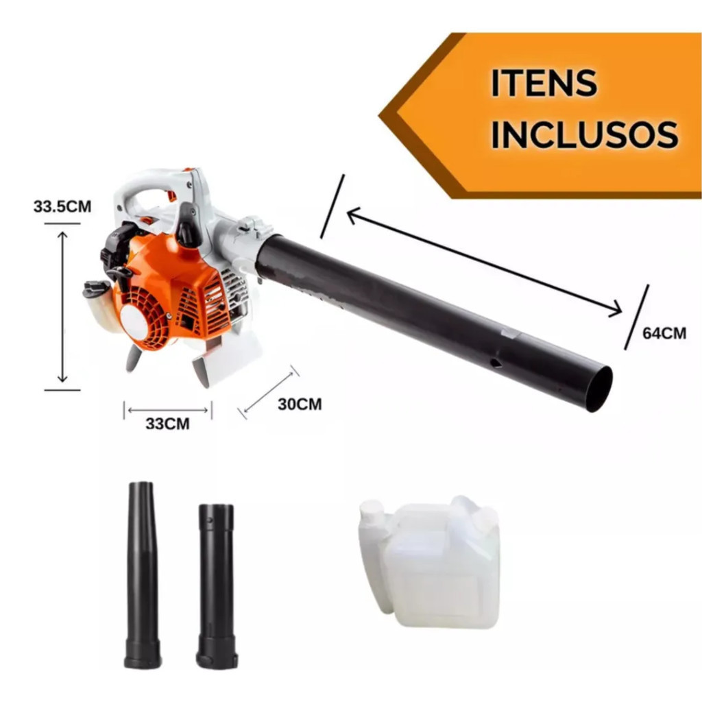 Soprador de Folhas a Gasolina – Potência, Mobilidade e Eficiência na Limpeza Externa O Soprador de Folhas a Gasolina é a escolha ideal para quem busca agilidade e desempenho na manutenção de jardins, calçadas e grandes áreas externas. Com um potente motor a gasolina 2 tempos, ele proporciona mais autonomia e mobilidade em comparação com os modelos elétricos, já que dispensa o uso de fios ou extensões. Seu design ergonômico foi pensado para garantir conforto mesmo em usos prolongados, tornando a limpeza de folhas, galhos e pequenos detritos uma tarefa mais leve, rápida e eficiente. Ideal tanto para uso profissional quanto residencial, este soprador é um aliado indispensável para quem preza por praticidade e resultados de alto nível. Características Técnicas: Aplicação: Uso profissional Motor: Gasolina 2 tempos (mistura 25:1) Potência: 52cc Rotação: 7.500 RPM (máxima) / 3.000 RPM (mínima) Velocidade do ar: 77,78 m/s (equivalente a 280 km/h) Volume do ar: 470 m³/h Partida: Manual retrátil Capacidade do tanque: 650 ml Consumo aproximado: 0,65 L/h Autonomia: Cerca de 1 hora de uso contínuo Nível de ruído: 114 dB Itens Inclusos: 1 Soprador de folhas a gasolina 1 Manual de instruções Acessórios de montagem (se aplicável) Garantia do Vendedor: 3 meses contra defeitos de fabricação ATENÇAO: Prezado cliente, agradecemos pela preferência. Sua satisfação é muito importante para nós, por isso testamos todos nossos produtos antes de enviá-los. Estamos à disposição, Nosso horário de atendimento é de Segunda a sexta-feira das 8:00 ás 18:00. ATT: KASAC-FORCE-TOOLS