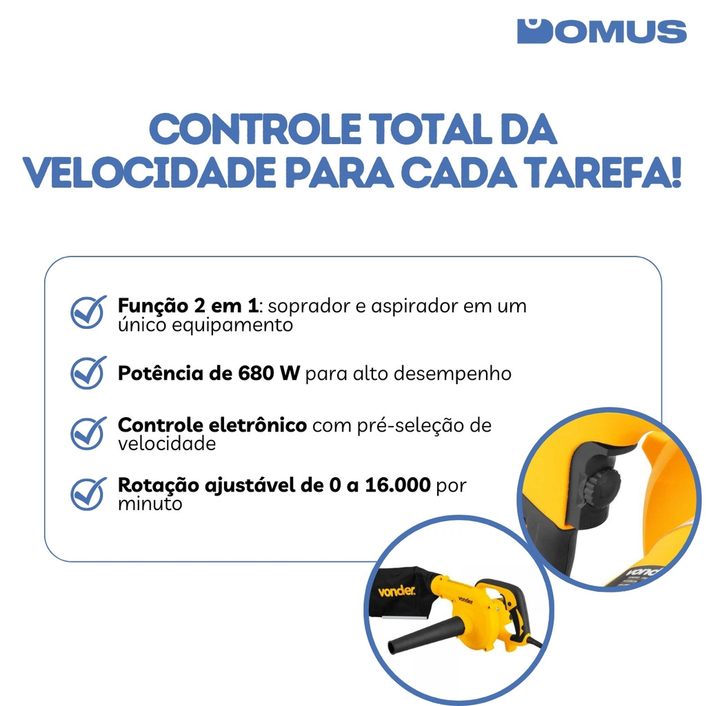 ***PRODUTO A PRONTA ENTREGA COM ENVIO IMEDIATO*** PRODUTO ORIGINAL COM NOTA FISCAL Soprador e Aspirador de Ar SAV 680 680 W 127 V – 2 em 1 com pré-seleção de velocidade e empunhadura emborrachada. O SAV 680 combina as funções de soprar e aspirar em um equipamento compacto para manutenção e limpeza de oficinas, indústrias, comércios e residências. Com 680W de potência e controle eletrônico com pré-seleção de velocidade, permite ajustar a rotação de 0 a 16.000 por minuto para trabalhar desde poeiras finas até resíduos mais pesados. O botão trava do interruptor facilita usos contínuos, enquanto o motor com dupla isolação aumenta a segurança do operador. A empunhadura emborrachada melhora a pegada e o conforto. Certificado conforme Portaria Inmetro nº 148/2022 e normas IEC 60335-1 e IEC 60335-2-2, é indicado para soprar e aspirar pó, poeira, pequenas folhas e para manter limpos bancadas e áreas de trabalho. Informações técnicas: Modelo: SAV 680 Potência: 680 W Tensão: 127 V~ Frequência: 50/60 Hz Rotação: 0–16.000 por minuto Volume de saída de ar: 0–246 m³/h Índice de proteção: IPX0 Aceleração nas mãos-braços ah: 4,65 m/s² Incerteza k: 1,5 m/s² Conformidade: IEC 60335-1 e IEC 60335-2-2; Portaria Inmetro 148/2022 Certificado: CERT-ELT-0148/C0255-22 Massa aproximada: 1,8 kg Conteúdo da embalagem: 1 Soprador e aspirador SAV 680; 1 Tubo; 1 Saco coletor; Manual de instruções Manutenção e garantia Manutenção básica: limpe o saco coletor e o tubo após o uso; mantenha entradas de ar desobstruídas; verifique periodicamente cabos e conexões Garantia: 90 dias Observações importantes: Utilize EPIs adequados (óculos, máscara e protetor auricular em ambientes ruidosos) Não use sob chuva ou em áreas molhadas (IPX0) Respeite os ciclos de trabalho e ajuste a velocidade conforme o material para maior vida útil Finalize sua compra e conte com um soprador/aspirador potente, seguro e versátil para manter seu local de trabalho sempre limpo.