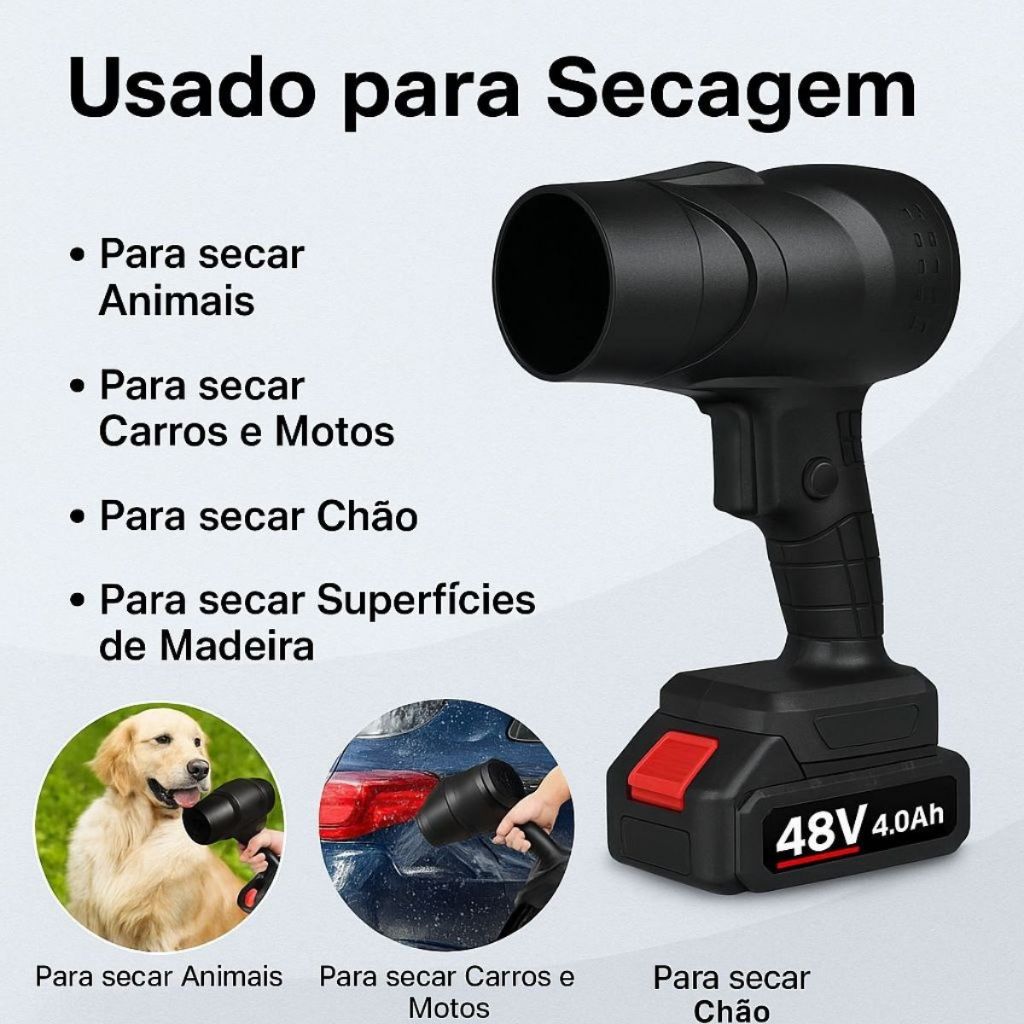 Soprador De Folhas Turbo Portátil Recarregável 48v 2 baterias Bivolt Forte - Grande ou Pequeno Soprador Turbo 1050W – Potência e Eficiência ao Seu Alcance! 2 Opções de soprador (MINI SOPRADOR TURBO OU SOPRADO TURBO 1050W) Desempenho de alto nível para limpeza e secagem com praticidade. O Soprador Turbo 1050W é ideal para quem busca uma solução potente e versátil. Com motor de 1050 watts, ele oferece uma vazão de ar intensa, perfeita para: ✅ Limpeza de cantos difíceis ✅ Oficinas e jardins ✅ Equipamentos eletrônicos ✅ Secagem rápida de carros e motos, sem contato e sem riscos na pintura 🔧 Especificações Técnicas: Modelo: Soprador Turbo Potência: 1050W Alimentação: Bateria recarregável Design: Ergonômico, leve e fácil de manusear Velocidade do ar: Alta vazão para desempenho superior Aplicações: Limpeza e secagem de áreas externas, veículos e muito mais Função: Soprador 📦 Itens Inclusos: 1 Soprador 2 Baterias recarregáveis bivolt 1 Carregador automático bivolt Garanta o seu agora e tenha a potência que você precisa para limpar e secar com agilidade e segurança! 🌬️ FASTTURBO – Ventilador Portátil Potente e Moderno Leve, moderno e cheio de recursos! O FASTTURBO oferece conforto e praticidade onde quer que você esteja.