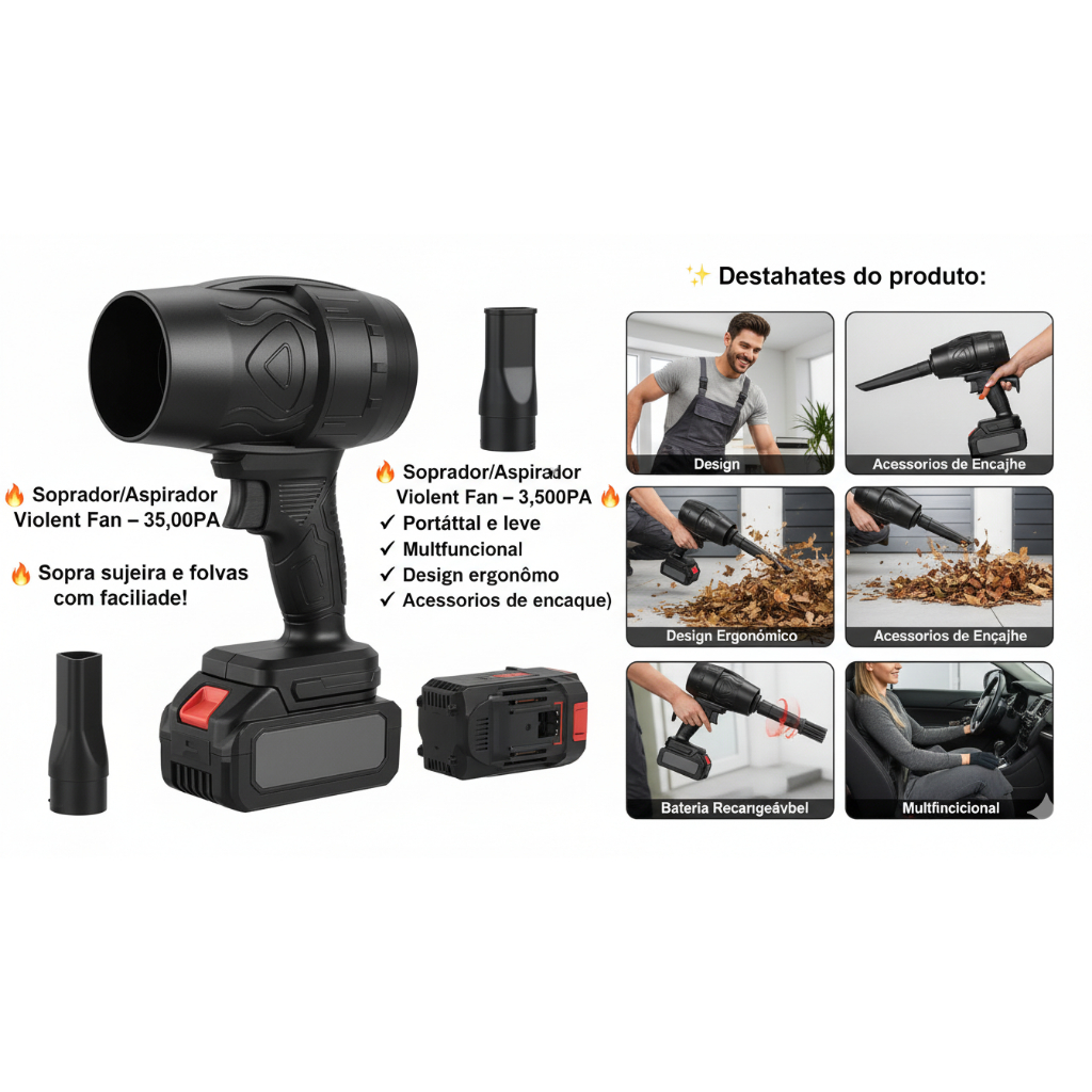 🔥 Soprador/Aspirador Portátil Violent Fan – 35.000PA 🔥 NÃO ACOMPANHA MALETA Tenha potência e praticidade em suas mãos! O Violent Fan é ideal para soprar folhas, poeira, sujeiras e até pequenos resíduos, deixando seu ambiente limpo com rapidez e eficiência. ✨ Destaques do produto: ✔ Alta potência de sucção e sopro – 35.000PA ✔ Portátil e leve – fácil de usar em qualquer lugar ✔ Design ergonômico – pegada firme e confortável ✔ Multifuncional – pode ser usado como soprador ou aspirador ✔ Bateria recarregável (não inclusa na versão da caixa) 📦 O pacote inclui: 1 Soprador/Aspirador portátil Violent Fan Acessórios de encaixe (bocal) ========================================================================================================== ✨ Aspirador de Pó Portátil Sem Fio Multifuncional MAX – Recarregável e Potente ✨ Mantenha sua casa, carro e escritório sempre limpos com praticidade! Com design moderno tipo pistola, este aspirador portátil é leve, recarregável e super potente, perfeito para o dia a dia. 🌟 Principais benefícios: ✔ Sem fio e portátil – liberdade total de movimento. ✔ Design ergonômico – formato em pistola, fácil de segurar. ✔ Bateria recarregável de lítio – durável e econômica. ✔ Alta potência de sucção – remove poeira, migalhas, cabelos e sujeiras. ✔ Multifuncional – ideal para carros, sofás, móveis, teclados e cantos de difícil acesso. ⚡ Especificações técnicas: Modelo: Multifunction Vacuum Cleaner Tipo: Aspirador portátil sem fio Alimentação: Bateria de lítio (recarregável) Carregamento: USB Cor: Preto Peso: leve e fácil de transportar Funções: aspirar poeira, cantos, superfícies e muito mais Acessórios: bicos adaptadores multifuncionais 📦 Conteúdo da embalagem: 1 Aspirador de pó portátil sem fio 1 Bateria MAX 1 Conjunto de bicos adaptadores 👉 Perfeito para quem busca praticidade, agilidade e eficiência em qualquer ambiente! ⚠️ Imagens meramente ilustrativas. As cores podem variar conforme o lote.