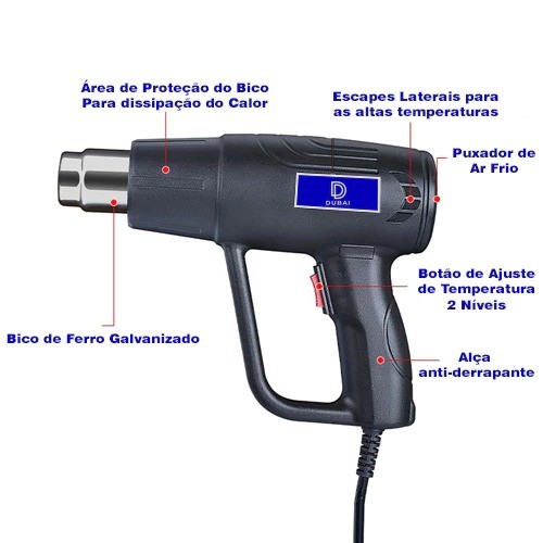 Soprador Térmico Modelo Heat Gun 220v: A Ferramenta de Soldagem que Você Precisa Se você busca uma ferramenta de soldagem poderosa e versátil, o Soprador Térmico Modelo Heat Gun 220v é a escolha certa. Com uma potência de 2000W, este soprador térmico oferece desempenho excepcional e flexibilidade para atender a diversas necessidades de aquecimento. Características do Produto: • Proteção Anti-Queimadura: Nossa lanterna de soldagem a ar quente é projetada com um protetor de mão anti-queimadura para garantir uma experiência de soldagem segura. Além disso, o revestimento de alta qualidade oferece um nível adicional de proteção, proporcionando uma soldagem segura e confiável. • Poder de Aquecimento Imbatível: Com um fio de aquecimento duplo integrado, esta tocha de soldagem a ar quente produz um fluxo contínuo e potente de ar quente. Sua rápida velocidade de aquecimento e temperatura estável a tornam capaz de atender a uma variedade de necessidades de aquecimento. • Controle de Temperatura Exclusivo: O ajuste de velocidade do vento em dois níveis permite que você otimize o controle de temperatura de acordo com suas necessidades de soldagem. Escolha a temperatura ideal com facilidade e precisão, garantindo um desempenho de soldagem eficiente e sem esforço. • Prioridade de Segurança: Equipada com um mecanismo de proteção contra superaquecimento, a tocha de soldagem a ar quente desliga automaticamente a energia quando a temperatura atinge níveis críticos. Isso ajuda a evitar incêndios e danos ao equipamento, ao mesmo tempo que garante a longevidade da ferramenta. • Tocha de Soldagem Multiuso: Esta ferramenta versátil é adequada para uma ampla variedade de aplicações, seja em ambientes de negócios, residenciais ou industriais. Ela pode lidar com tarefas como dobrar PVC, decapar tinta, encolher tubos, projetos de artesanato DIY e muito mais. Com seu design durável e operação fácil, é a escolha ideal para qualquer projeto. Com o Soprador Térmico Modelo Heat Gun 110v, você está equipado para enfrentar uma ampla gama de desafios de soldagem com confiança. Não importa se você é um profissional experiente ou um entusiasta de projetos de bricolagem, esta ferramenta oferece o desempenho necessário. Adquira o seu agora e descubra como esse soprador térmico poderoso e versátil pode elevar o nível dos seus projetos de soldagem.