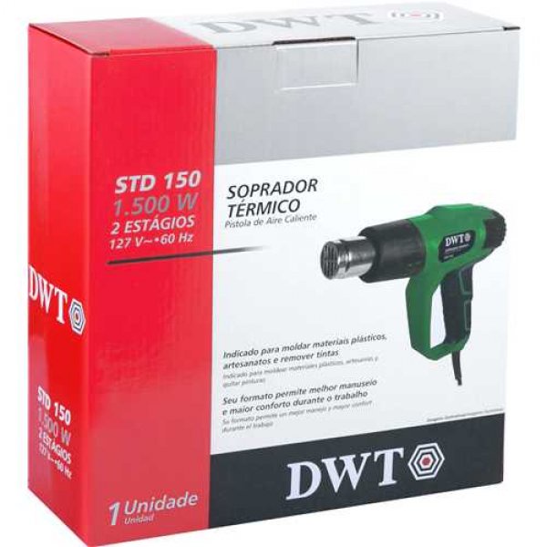 Indicado para moldar materiais plásticos, realizar artesanatos e remover tintas. Produz um fluxo de ar em alta temperatura, ideal para profissionais como encanadores, marceneiros, carpinteiros e pintores. Também é muito útil em fábricas de móveis e em atividades como moldagem e instalação de canos de PVC, secagem de pinturas, aplicação de películas e outras tarefas similares. O produto é certificado conforme as normas IEC 60335-1, IEC 60335-2-45 e Portaria 371/2009 do Inmetro, garantindo qualidade e segurança. Seu formato tipo pistola proporciona melhor manuseio e conforto durante o uso, e o motor com dupla isolação assegura maior proteção ao operador. Conteúdo da Embalagem: 1 Soprador térmico + 1 bocal plano, 1 bocal de desvio, 1 bocal de ponta e 1 bocal de deflexão. Detalhes Técnicos: Modelo: STD 150 Tensão: 127 V~ Frequência: 60 Hz Estágios de temperatura: 2 Potência máxima: 1.500 W Temperaturas: 300°C e 550°C Fluxo de ar: 280 e 480 L/min Peso aproximado: 1,03 kg