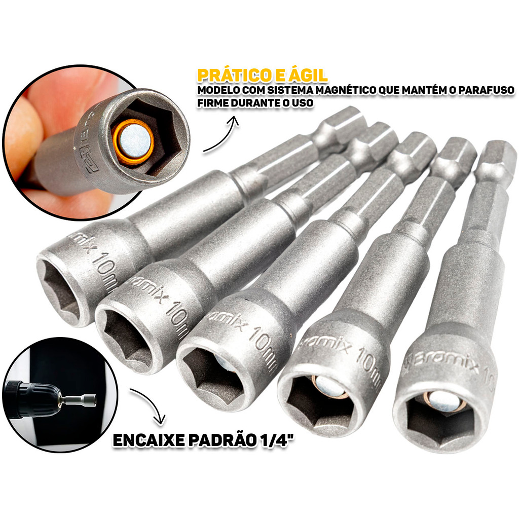 Soquete Canhão Magnético Bramix 10mm x 65mm Kit 5 Peças P/ Ferramentas Parafusadeira Construção