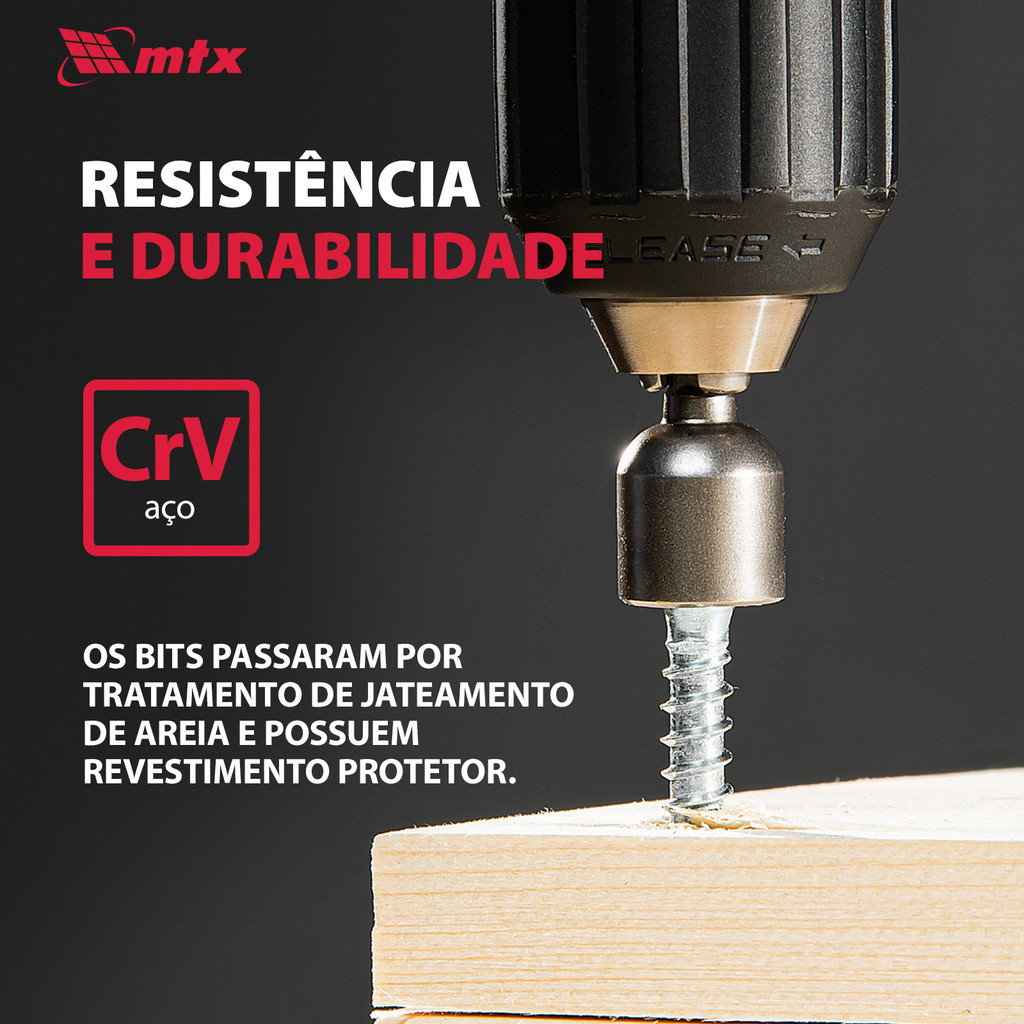 Bits com Cabeças de Ponta MTX 117899 – Eficiência e Versatilidade em Fixação O conjunto MTX 117899 conta com 2 bits de 13 x 45 mm, perfeitos para montagem e desmontagem de parafusos com hexágono externo, incluindo parafusos de telhado. O comprimento estendido facilita o acesso a locais difíceis, aumentando a versatilidade e eficiência. Principais Benefícios: Aço CrV resistente: Alta durabilidade e resistência à corrosão para uso intenso. Ímã embutido: Garante fixação segura dos parafusos, prevenindo quedas e deslizes. Tratamento de jateamento e revestimento: Prolonga a vida útil e mantém a performance. Conjunto com 2 bits: Praticidade e reserva imediata para tarefas variadas. MTX 117899 – Para Profissionais Ideal para quem busca precisão, durabilidade e praticidade, este conjunto é indispensável para trabalhos em áreas de difícil acesso, garantindo resultados confiáveis e profissionais.