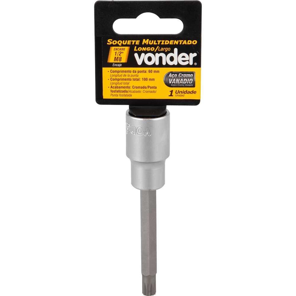 Cod. Fornecedor: 3538200008 Marca: Vonder Conteúdo da embalagem: 1 Soquete multidentado. Destaques e diferenciais: Produzido em aço cromo vanádio, proporcionando maior resistência e durabilidade. Possui acabamento cromado que confere maior proteção contra a oxidação/corrosão. Aplicações e dicas de uso: Indicado para fixar e soltar parafusos multidentados. Garantia legal: 90 dias Qualificação Técnica Tipo de soquete: Multidentado Medida do encaixe (pol): 1/2" Medida do soquete: M8 Comprimento da ponta: 60 mm Comprimento total: 100 mm Material : Aço cromo vanádio Acabamento: Cromado fosco com ponta fosfatizada Massa aproximada (peso) (kg): 0,12 kg