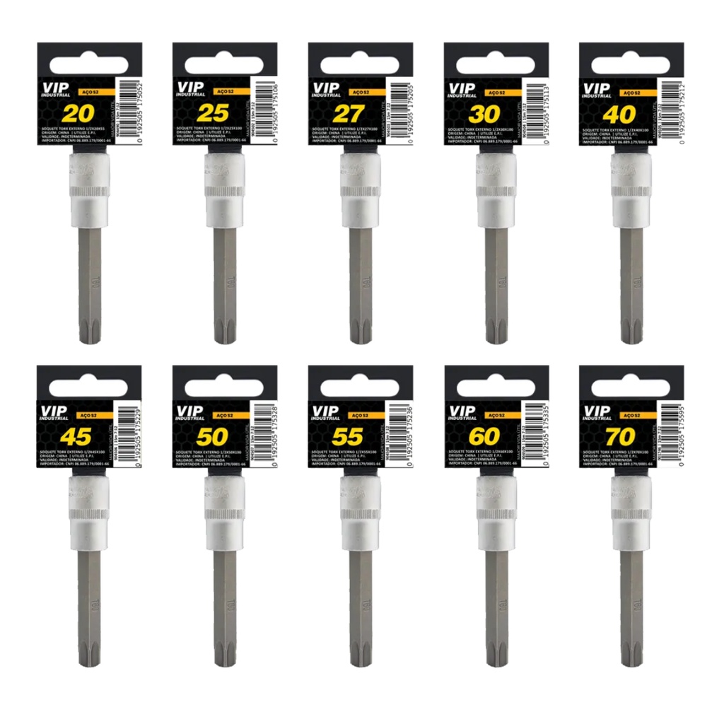 Chave Soquete torx Macho longo T-30 fabricados em aço Cromo Vanádio S2 de alta qualidade produto resistente a corrosão soquetes enc. 1/2" Tabela de medidas abaixo : Codigo, Medido torx, Altura e Diametro superior Tabela de medidas tambem na imagem no produto Código Medida Altura (L) Diametro Superior (D) 904501 20 100 22 904502 25 100 22 904503 27 100 22 904504 30 100 22 904505 40 100 22 904506 45 100 22 904507 50 100 22 904508 55 100 22 904509 60 100 22 901746 70 100 22