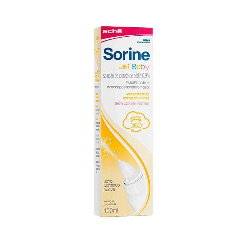 Sorine Jet Baby 0,9% Solução Nasal Jato Contínuo Suave 100ml Sorine Jet Baby é um medicamento em solução nasal composto por cloreto de sódio 0,9% com ação fluidificante e descongestionante nasal. Uso pediátrico acima de 0 anos. O que é Sorine Jet Baby e para que é utilizado? Sorine Jet Baby é indicado como fluidificante e descongestionante nasal. Como o medicamento Sorine Jet Baby funciona? Sorine Jet Baby age fluidificando a secreção da mucosa nasal, favorecendo a sua eliminação. Sorine Jet Baby pode ser usado como fluidificante das secreções nasais em resfriados, rinites, sinusites e em quaisquer outras condições relacionadas ao ressecamento da mucosa nasal, como baixa umidade do ar, exposição ao ar condicionado e poluição. Pode ser utilizado também para limpeza delicada das secreções em pós-operatórios nasossinusais. Sorine Jet Baby é uma solução nasal de cloreto de sódio que não contém vasoconstritores nem conservantes em sua formulação e, por isso, não causa rinites medicamentosas, dependência ou hiperemia reacional (vermelhidão). Sua embalagem foi especialmente desenvolvida para evitar a contaminação da solução, não necessitando, portanto, o uso de conservantes, que podem irritar a via respiratória. Como devo usar Sorine Jet Baby? Aplique a solução nas narinas, conforme necessidade. Siga corretamente o modo de usar. Em caso de dúvidas sobre este medicamento, procure orientação do farmacêutico. Não desaparecendo os sintomas, procure orientação de seu médico ou cirurgião-dentista. Quem não deve usar Sorine Jet Baby? Você não deve utilizar este medicamento se tiver antecedentes de hipersensibilidade (alergia) aos componentes da fórmula. Quais são os efeitos colaterais de Sorine Jet Baby? Não há relatos de reações adversas a esse medicamento. Informe ao seu médico, cirurgião-dentista ou farmacêutico o aparecimento de reações indesejáveis pelo uso do medicamento. Informe também à empresa através do seu serviço de atendimento.