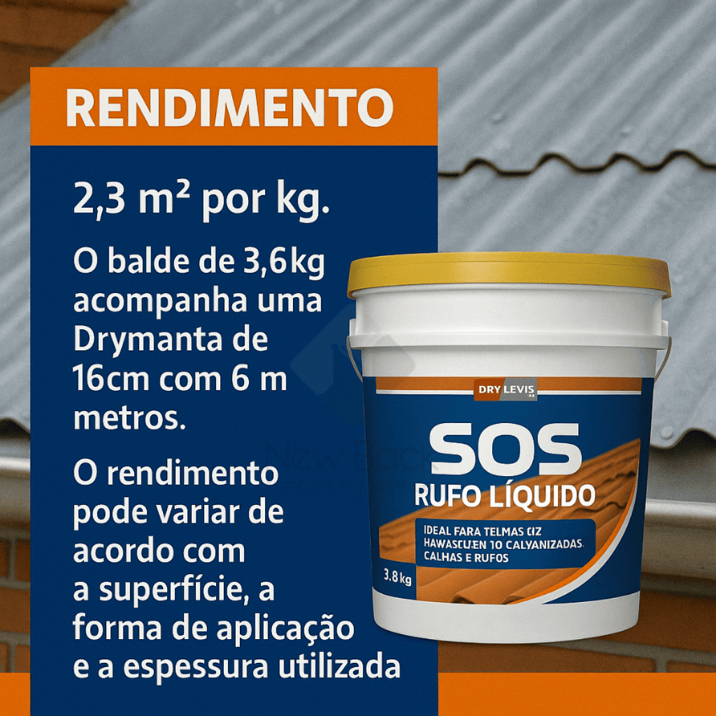 ESSE BALDE DE 3,6KG RENDE 8,28m² / 6 m² de manta O Rufo Líquido é ideal para vedação de trincas e fissuras ocasionadas pela movimentação natural das estruturas e espaços deixados por pregos e parafusos, impedindo a penetração de água. Produto flexível, aceita pinturas isentas de solvente, à base de látex ou de emulsões acrílicas. Benefícios Corrige furos, trincas e fissuras de até 10mm, de fácil aplicação, acompanha a movimentação do substrato, resistência a intempéries e raios solares, produto pronto para o uso. Indicação Produto indicado para preenchimento de fissuras. Corrige e nivela imperfeições sem rachaduras em calhas e rufos. Uso interno e externo. Preparação da Superfície Eliminar todo pó, manchas de gordura ou graxa, mofo, partes soltas e deixar o substrato livre de qualquer impregnação que possa prejudicar a aderência do produto ao substrato. Se for necessário, lixar e lavar a superfície para deixá-la firme. Aplicação do produto Com o auxílio de uma espátula ou desempenadeira. Aplicar o produto sobre a fissura com o auxílio de uma espátula adequada para o trabalho, pressionando levemente até obter o nivelamento, evitando deixar espaços vazios. Em fissuras acima de 5mm é recomendado utilizar uma fita de tecido não tecido ou fita telada de fibra de vidro de 10cm de largura COM A BANDAGEM VOLTADA para a trinca, se o sentido da trinca mudar, corte a fita de modo que fique no sentido da trinca, preencha a superfície até o nivelamento desejado. O produto pode ser utilizado para dar acabamento, como tinta e impermeabilizante para telha quando diluído a 20%. Diluído a 10% pode ser utilizado como manta líquida impermeabilizante. Aplique de duas a três demãos com rolo, trincha ou pincel. Composição Emulsão acrílica, cargas minerais inertes, aditivos. Rendimento 2,3 m² por kg. Tempo de secagem Cura total aproximadamente 24 horas (25°C e 60% URA). A secagem pode sofrer variações de acordo com a espessura de massa utilizada. Tipo de produto Não inflamável. Validade 24 meses a partir da data de fabricação, desde que a embalagem esteja fechada adequadamente (25°C e 60% URA). Limitações Este produto não deve ser aplicado em superfícies esmaltadas, enceradas, vitrificadas ou não porosas. Não deve ser aplicado em locais que liberam óleo, plastificantes ou solventes gaxetas de vedação de borracha natural ou parcialmente vulcanizadas ou fitas; em superfícies cuja temperatura esteja abaixo de 10ºC ou acima de 40ºC. Garantia do vendedor: 30 dias