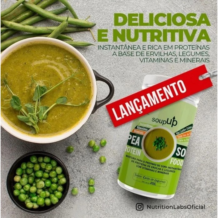A Soup Up é uma sopa proteica 100% vegana, elaborada com proteína concentrada da ervilha como principal fonte de proteína. O produto contém legumes desidratados, vitaminas e minerais adicionados, oferecendo praticidade para o preparo de uma refeição leve, conforme o modo de preparo indicado. Apresenta sabor Caldo de Legumes e é indicada para adultos que buscam uma opção vegetal para o dia a dia, dentro de uma alimentação equilibrada. CONTEÚDO DA EMBALAGEM • 1 unidade de Soup Up – Sopa Proteica 100% Vegana • Peso líquido: 450 g • Sabor: Caldo de Legumes INGREDIENTES Proteína concentrada de ervilha (Pea Protein), mandioquinha desidratada, polidextrose (fibra dietética solúvel), cenoura desidratada, cebola desidratada, brócolis desidratado, espinafre desidratado, caldo de legumes em pó, fosfato tricálcico, óxido de magnésio, cloreto de sódio, sulfato de zinco, pirofosfato de ferro, sulfato de manganês, sulfato de cobre, picolinato de cromo, iodeto de potássio, selenito de sódio, ácido ascórbico (Vitamina C), niacina (Vitamina B3), alfa-tocoferol (Vitamina E), pantotenato de cálcio (Vitamina B5), cloridrato de piridoxina (Vitamina B6), riboflavina (Vitamina B2), nitrato de tiamina (Vitamina B1), acetato de retinol (Vitamina A), ácido fólico, biotina, colecalciferol (Vitamina D3), fitomenadiona (Vitamina K1), cianocobalamina (Vitamina B12), sal hipossódico, pimenta vermelha em pó e cúrcuma em pó. INFORMAÇÕES NUTRICIONAIS COMPLEMENTARES • NÃO CONTÉM GLÚTEN • SEM ADIÇÃO DE AÇÚCARES • FONTE DE PROTEÍNAS E FIBRAS • BAIXO TEOR DE SÓDIO MODO DE PREPARO Dissolver 30 g do produto (aproximadamente 3 colheres de sopa) em 200 ml de água quente, misturando até completa dissolução. CUIDADOS DE CONSERVAÇÃO Conservar ao abrigo da luz, do calor e da umidade.Após aberta, manter a embalagem bem fechada, em local seco e fresco, e consumir em até 30 dias.Lote e validade impressos na embalagem. INFORMAÇÕES IMPORTANTES • ESTE PRODUTO NÃO É UM MEDICAMENTO • ESTE NÃO É UM ALIMENTO BAIXO OU REDUZIDO EM VALOR ENERGÉTICO • CRIANÇAS, GESTANTES, NUTRIZES, IDOSOS E PESSOAS COM CONDIÇÕES ESPECÍFICAS DEVEM CONSULTAR MÉDICO OU NUTRICIONISTA ANTES DO CONSUMO • PRODUTO DISPENSADO DE REGISTRO CONFORME RDC Nº 240/2018 – ANVISA FAQ – PERGUNTAS FREQUENTES 1. A Soup Up substitui refeições? Não. O produto não deve ser considerado substituto de refeições, devendo ser consumido como parte de uma alimentação equilibrada. 2. O produto é vegano? Sim. É elaborado com ingredientes de origem vegetal. 3. Contém glúten? Não. Produto não contém glúten. 4. Possui açúcar adicionado? Não. O produto é sem adição de açúcares. 5. Quem pode consumir? Adultos saudáveis. Para grupos específicos, recomenda-se orientação profissional.